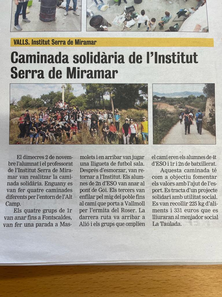 El dimecres 2 de novembre l’alumnat i el professorat de l’Institut Serra de Miramar van realitzar la caminada solidària. Enguany es van fer quatre caminades diferents per l’entorn de l’Alt Camp.