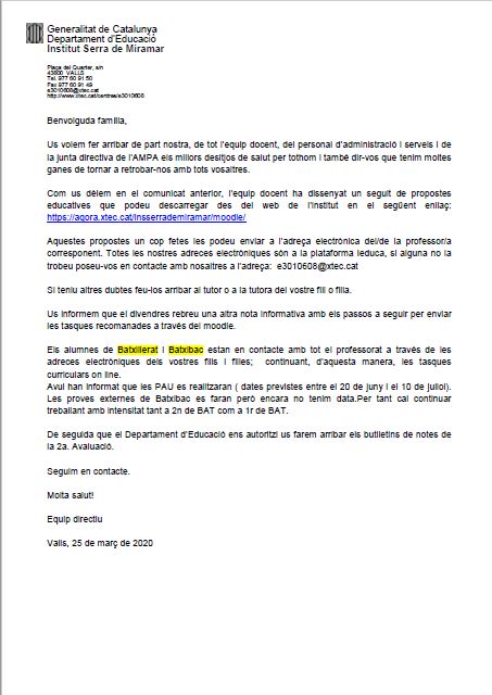 Carta a les famílies del 25 de març