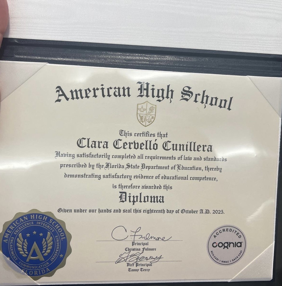 Amb aquesta titulació, la Clara forma part del grup d’alumnes del nostre centre que han completat amb èxit un batxillerat doble, combinant els estudis espanyols amb el títol americà, una experiència que els prepara per a un futur acadèmic i professional internacional.