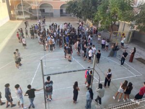 Valls, 23 de setembre de 2025 — Durant el matí del dijous passat, dia 18 de setembre a les 11.30 h, durant l’hora del pati de 3r i 4t d’ESO i de tots els cursos de batxillerat, l’alumnat de 1r de batxillerat de l’Institut Serra de Miramar va protagonitzar una acció simbòlica de denúncia contra la greu situació humanitària que es viu actualment a Palestina. Aquest acte es va realitzar simultàniament a molts centres públics d’arreu del país, convocats per la plataforma Educació per Palestina