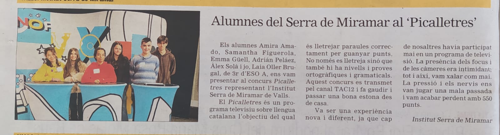 Els alumnes Amira Amado, Samantha Figuerola, Emma Güell, Adrián Peláez, Àlex Solà i jo, Laia Oller Brugal, de 3r d’ESO A ens vam presentar al concurs Picalletres representant l’Institut Serra de Miramar de Valls.