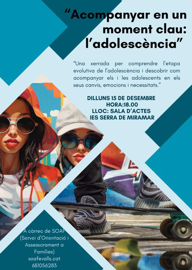 17/12/25La sala d’actes de l’Institut Serra de Miramar de Valls va acollir ahir al vespre la xerrada “Acompanyar en un moment clau: l’adolescència”, una trobada adreçada a famílies amb l’objectiu d’oferir eines i reflexions per comprendre millor aquesta etapa vital. L’activitat va estar organitzada per l’AMPA de l’Institut Serra de Miramar.