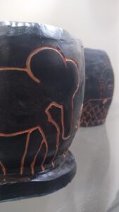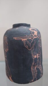 Amb els alumnes/artistes de Volum hem seguit aquesta idea, hem aprés a fer petits objectes ceràmics i, com els Grecs, hem seleccionat temes contemporanis que hem plasmat amb la tècnica del frottage sobre la superfície pintada de la ceràmica.