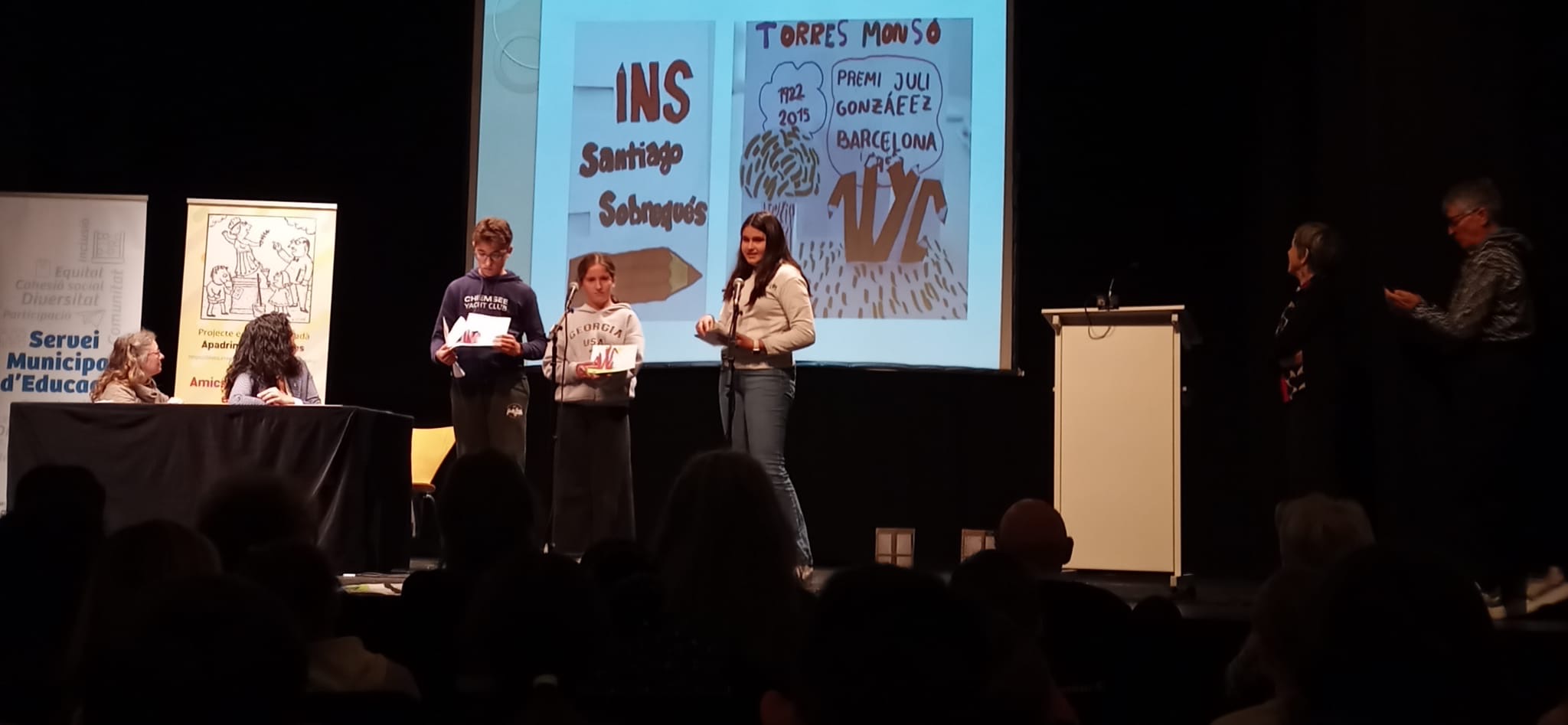 Els instituts i escoles que participem en el projecte “Apadrinem escultures” vam trobar-nos a La Mercè per posar en comú les activitats dutes a terme aquest curs. Els encarregats de presentar els treballs fets per l’alumnat de 2n d’ESO del nostre institut van ser l’Arlette Saubi, l’Arnau Jou i la Berta Boix.
