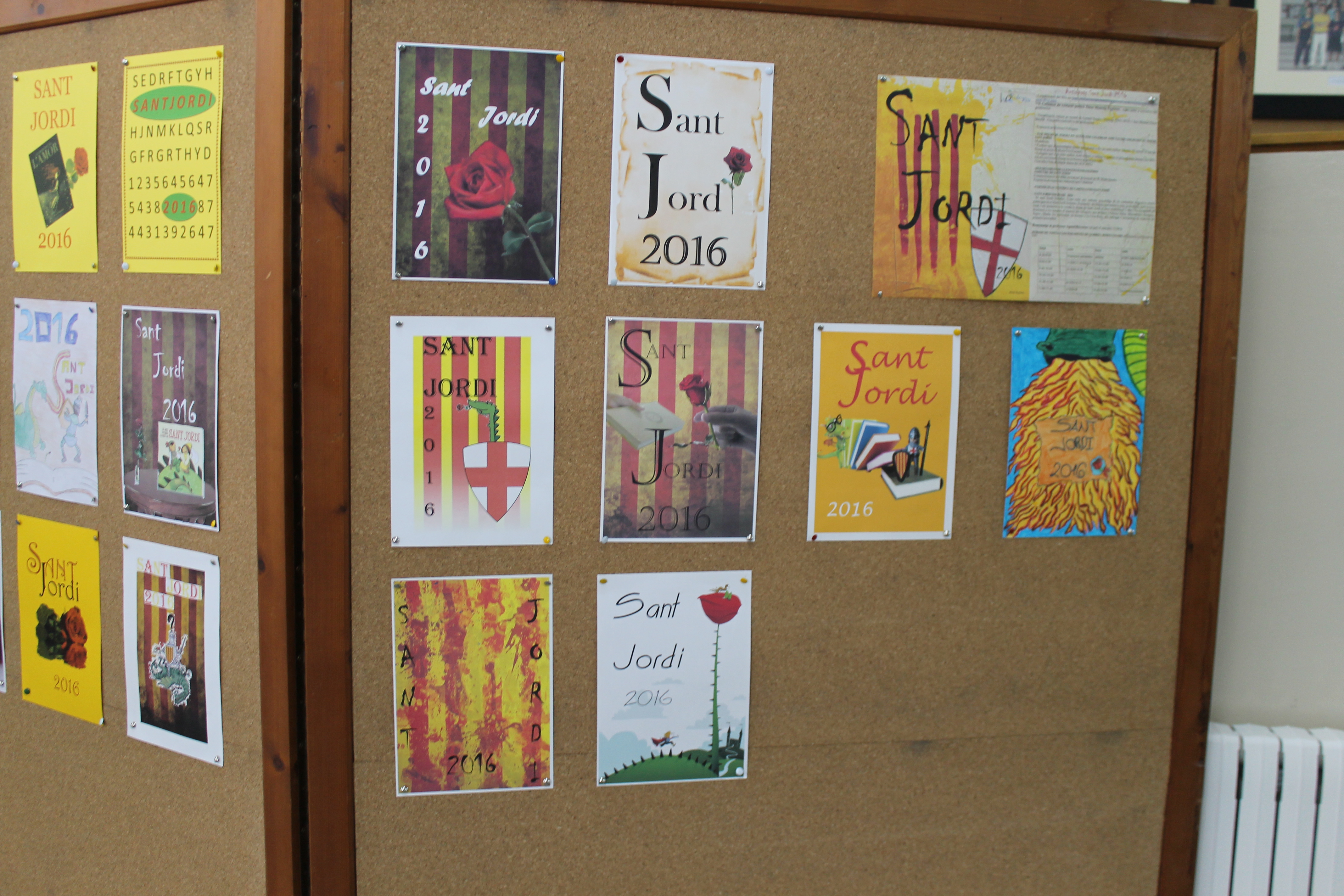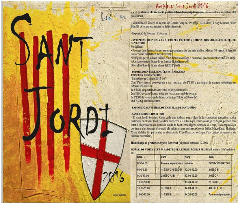 L’alumnat de 1r ESO, com va venint fent en els últims anys, va participar en el disseny d’un cartell que informa dels actes de la diada de Sant Jordi. Aquest cartell és una activitat més , dins de la matèria d’Educació Visual, amb la gratificació afegida, de participar en un concurs on el cartell guanyador serveix per enunciar les activitats previstes per aquesta jornada.