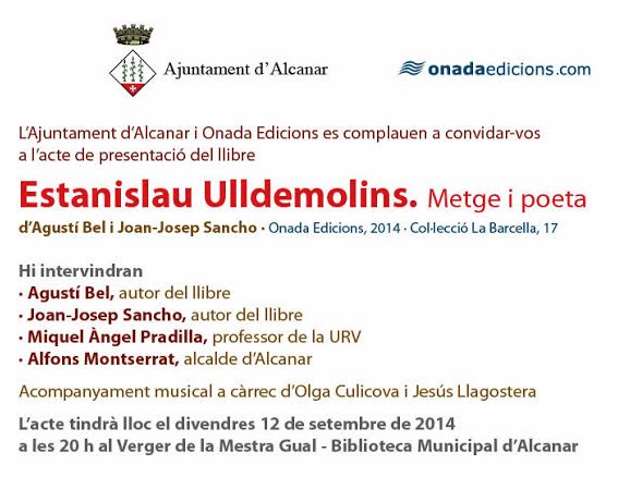 El proper divendres 12 de setembre 2014 a les 2oh tindrà lloc al Verger de la Mestra – Biblioteca Municipal “Trinitari Fabregat” d’Alcanar tindrà lloc la presentació del llibre “Estanislau Ulldemolins. Metge i poeta” publicat per Onada Edicions. El llibre ha estat escrit per Agustí Bel Beltran i Joan-Josep Sancho Esteller, autors locals ben coneguts per tots nosaltres, especialment Joan-Josep per haver estat director del nostre centre des del curs 2002-2003 fins al 2012-2013. Hem rebut per part dels autors i l’Ajuntament d’Alcanar una invitació a l’acte que fem extensiva a tota la comunitat educativa de l’Institut Sòl-de-Riu.