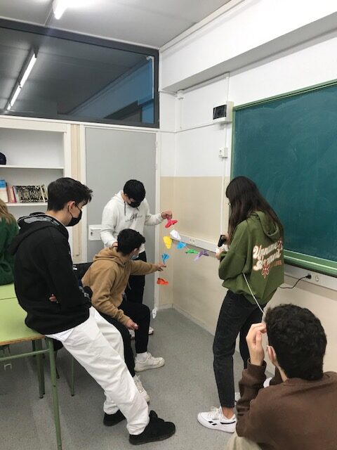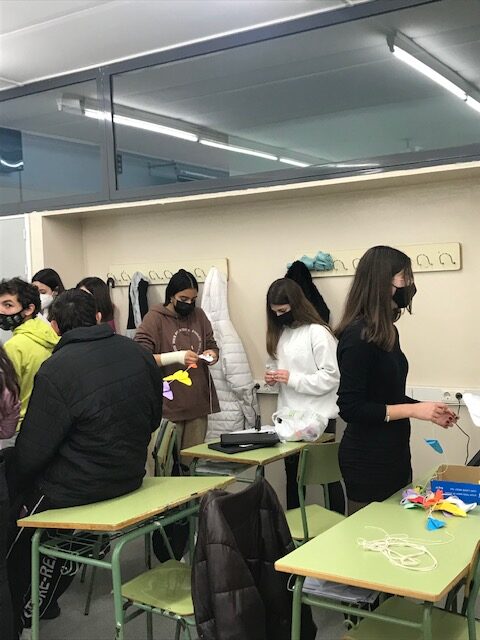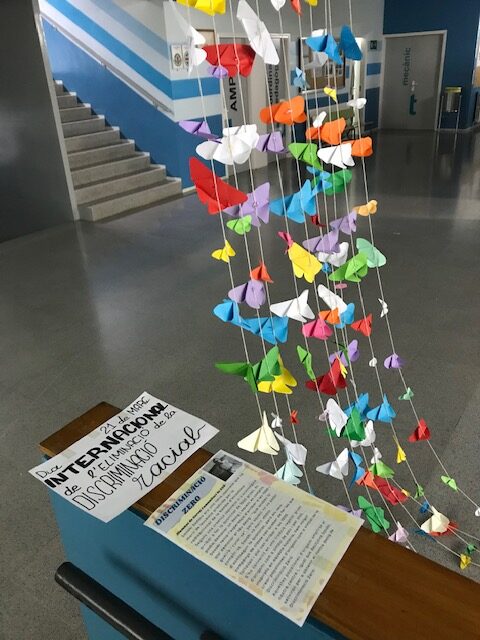 L’alumnat, seguint una tradició i creença japonesa, va confeccionar una pluja de grues que decorarà el hall de l’institut durant tota la setmana, per tal de rebutjar tot tipus de discriminació.