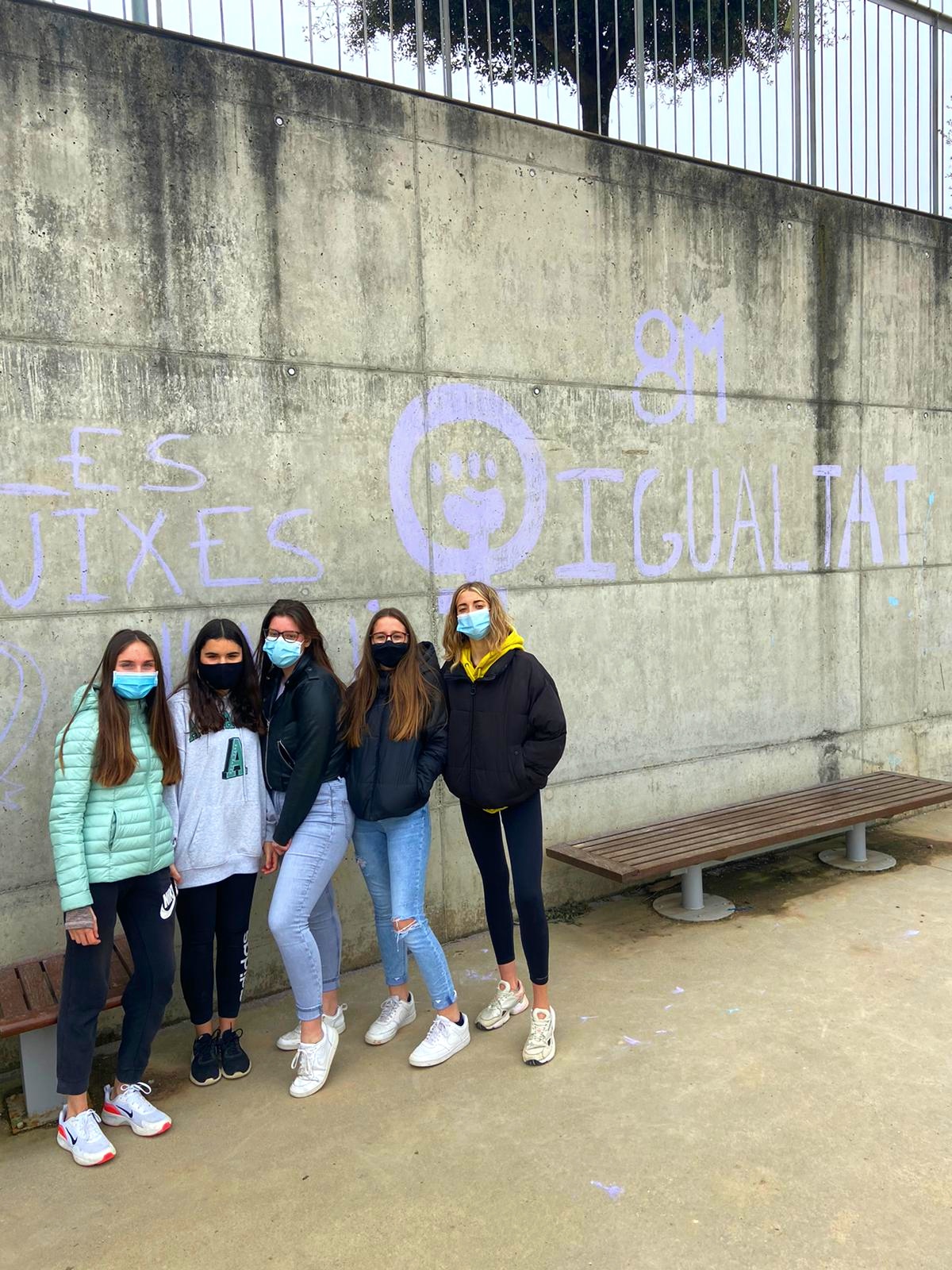 Per reivindicar el Dia Internacional de les Dones, l’alumnat de l’Institut ha portat a terme dues accions. L’alumnat de 4t ha llegit poemes reivindicatius a cada un dels dos patis i s’han pintat missatges reivindicatius amb guixos de color lila en espais delimitats del mur de formigó.
