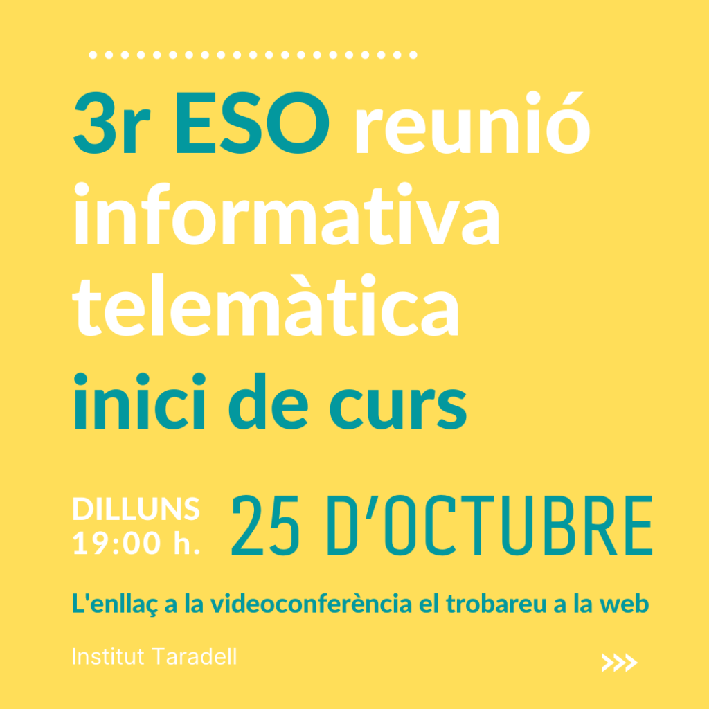 La reunió informativa d’inici de curs de 3r d’ESO es portarà a terme dilluns 25 d’octubre de forma telemàtica a les 19:00 hores.