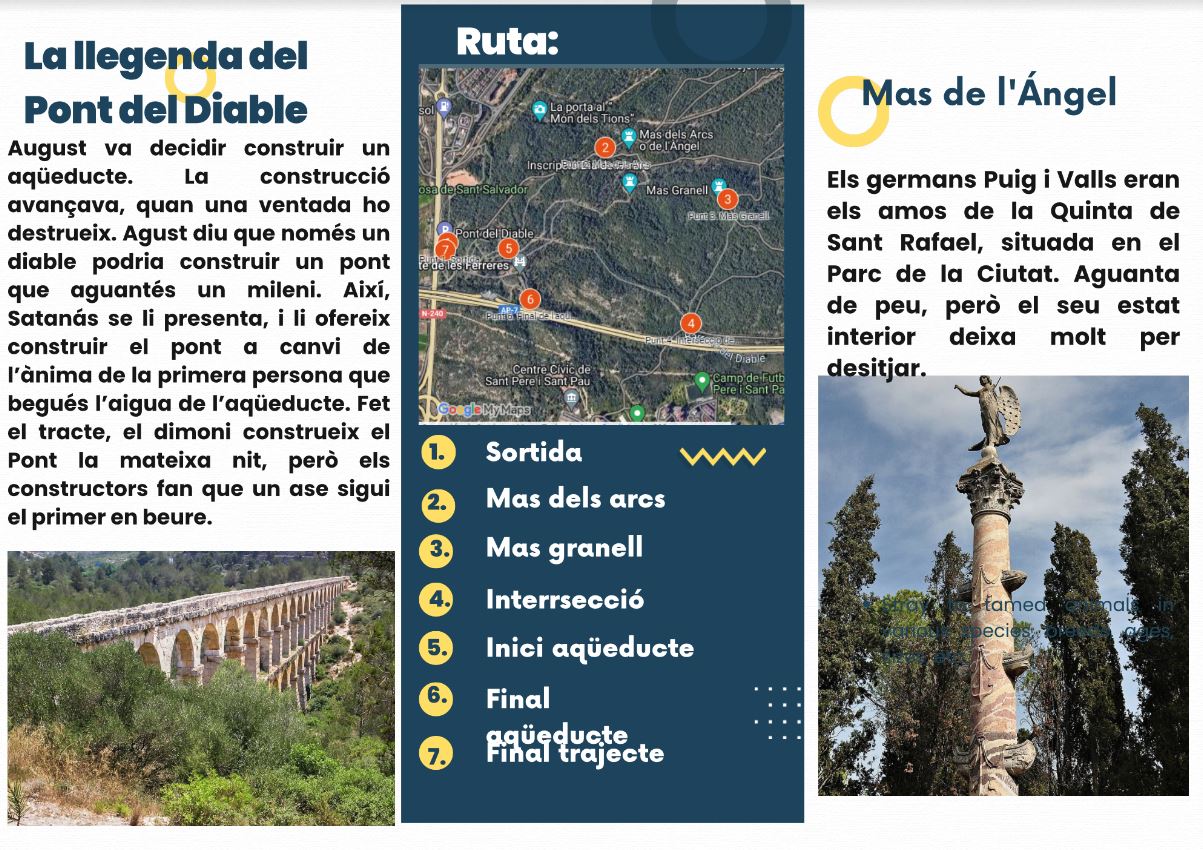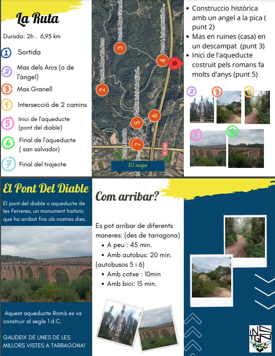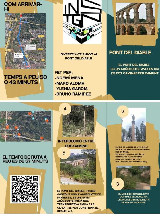 A 1r d’ESO consistia a elaborar tres productes comunicatius finals: un tríptic en llengua castellana sobre el Pont del Diable, un altre en llengua catalana i un TikTok d’un minut de durada en el qual havien d’explicar la llegenda del Pont del Diable en anglès. És un projecte que ha combinat una sortida senderista cap a l’aqüeducte de les Ferrreres, un temps de disseny i planificació dels tres elements comunicatius, un temps per aprendre a fer un tríptic en paper i un de virtual, i un temps d’edició dels vídeos de TikTok amb el programa CutCap o altres de similars. L’alumnat n’ha quedat content. Mireu alguns dels resultats.