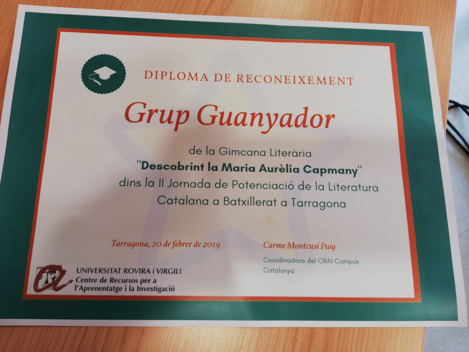 Tal com podeu veure en la foto, el passat dia 20 de febrer, l’equip format pels alumnes d’aquesta matèria tant del nostre institut, com del de Cambrils, van quedar els guanyadors absoluts d’una gimcana que girava al voltat de Mª Aurèlia Capmany, escriptora de la qual estem celebrant el seu centenari.
