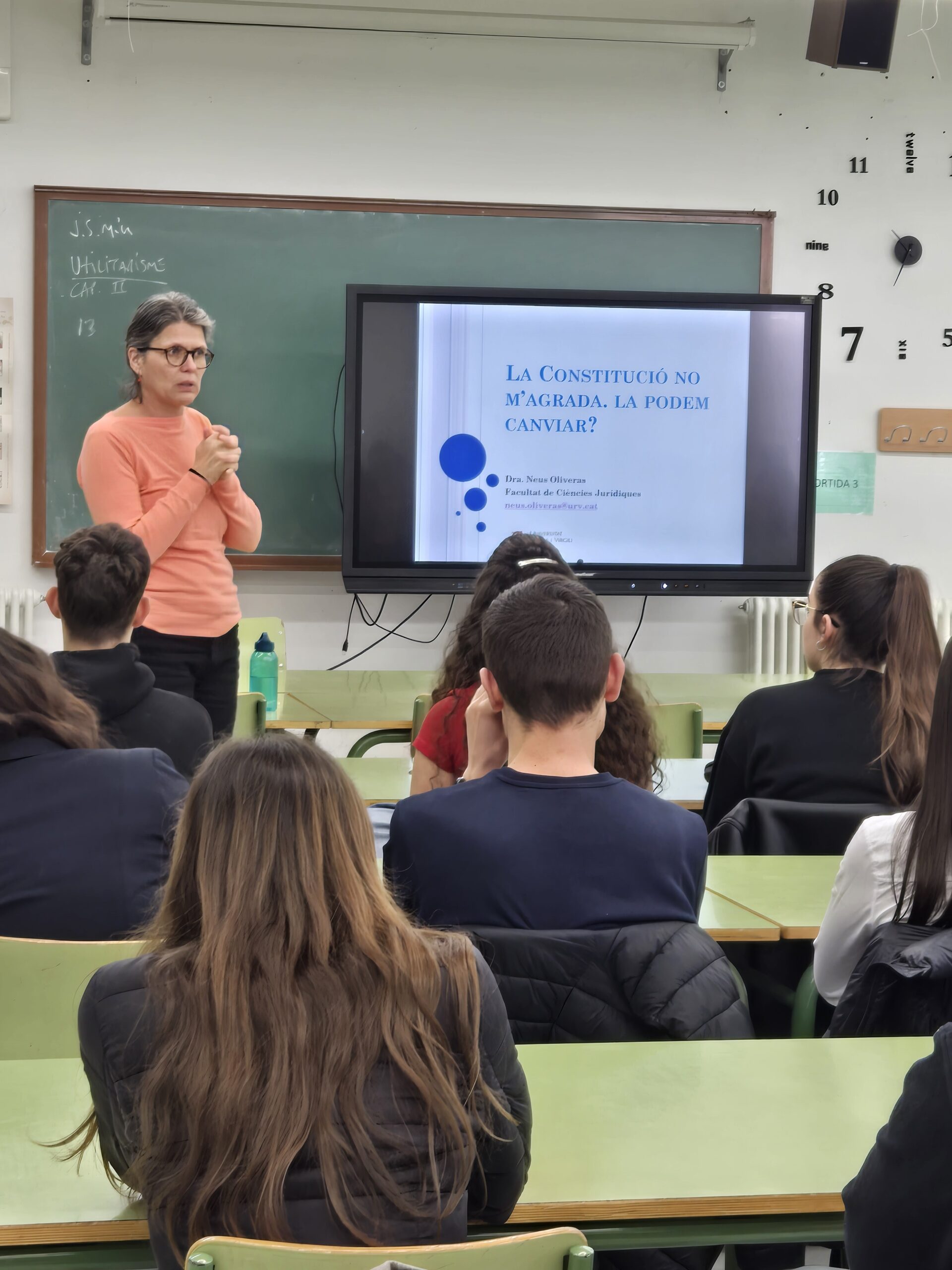 “La Constitució no m’agrada. La podem canviar?” Amb aquest plantejament tan suggerent, la Neus Oliveras Jané, Llicenciada en Dret i professora de Dret constitucional a la URV, ha exposat la seva conferència als alumnes de la matèria d’Història de 2n de batxillerat. En primer lloc, ha explicat la noció de Constitució partint del seu sentit i origen històric, fent especial incís en la dels EUA i la de la Revolució Francesa. Després, s’ha centrat en la Constitució espanyola de 1978 per explicar quan i en quines circumstàncies es va elaborar, quin és el seu contingut, quina posició ocupa en l’ordenament jurídic i si és possible i convenient canviar-la.