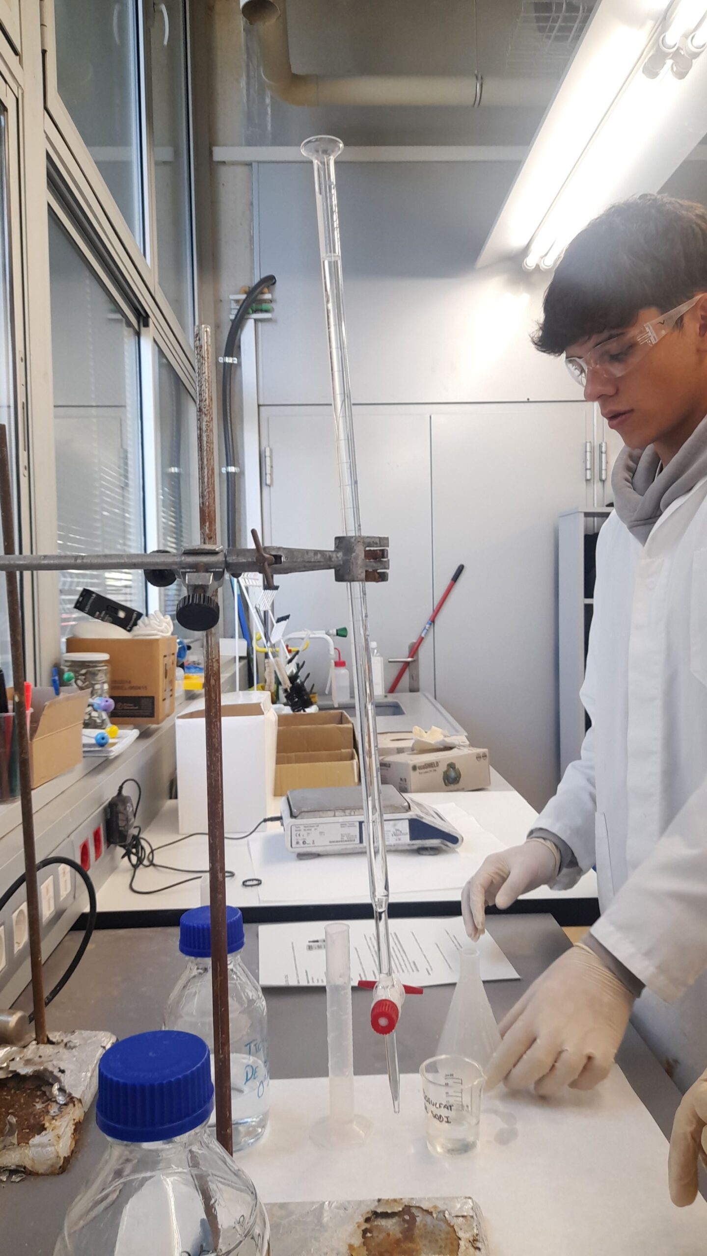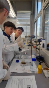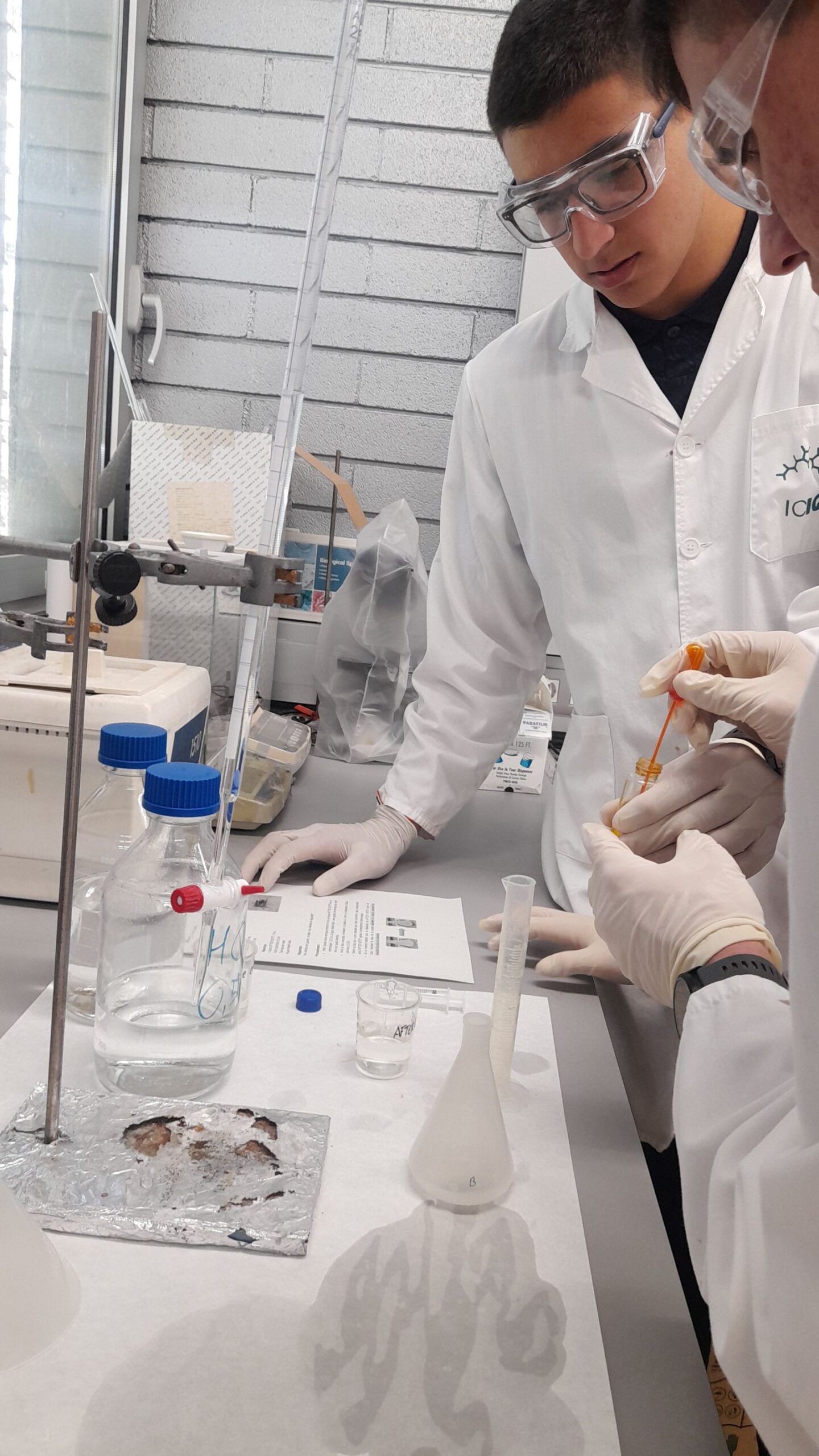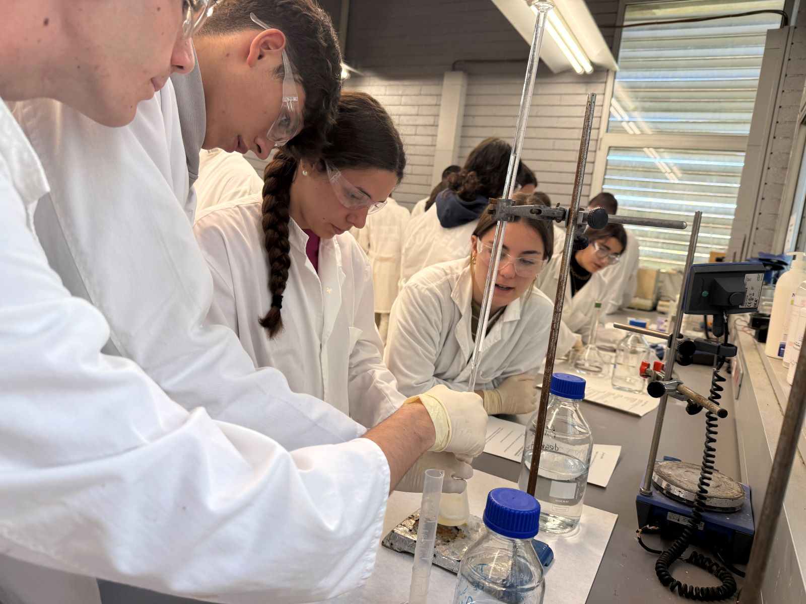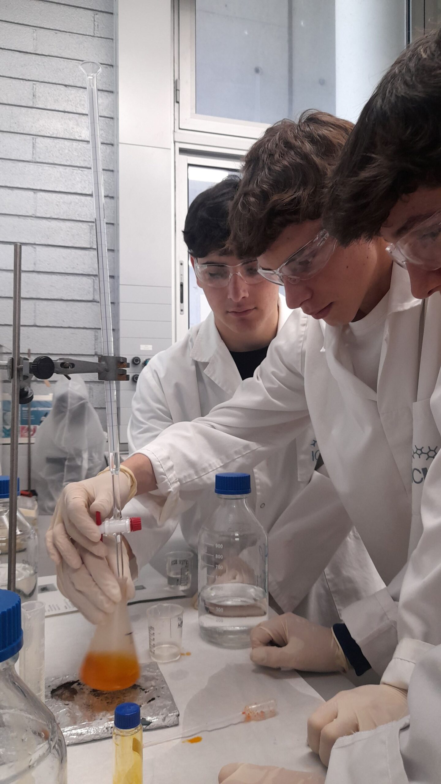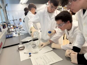 L’alumnat de 1r Bat científic que cursa l’assignatura de química ha assistit al taller de farmaciola, organitzat per l’Institut Català d’Investigació Química (ICIQ). En aquest taller han realitzat diferents tipus de reaccions amb els productes que tenim en una farmaciola, com poden ser el Betadine, l’aigua oxigenada, l’After Bite i les pastilles de Vitamina C. Han determinat la concentració de iode del Betadine, la concentració d’amoníac de l’After Bite, el poder absorbent dels bolquers, quins aliments contenen midó, han descomposat l’aigua oxigenada amb un catalitzador i han fet desaparèixer el que han escrit en un paper mitjançant una reacció redox. Un matí amb molta química!