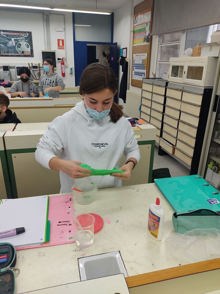 Durant la primera quinzena de març els alumnes de 2n d’ESO van experimentar amb slime dins les pràctiques de la matèria de Química. Es tracta d’una reacció de polimerització on intervenen com a reactius la cola vinílica (cola d’aferrar blanca) i una dissolució de bòrax. No cal dir que els alumnes s’ho han passat d’allò més bé tot manipulant els diferents materials.