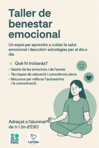 Els dies 25 de març i el 8 i 9 de març l’associació Tu Ceiba realitzarà els tallers d’educació emocional als alumnes de 1r d’ESO i durant els dies 23 i 24 de març seran els alumnes de 2n d’ESO que faran aquests tallers dirigits per la fundació JOV. Aquests tallers són la continuació dels que ja es van fer amb els mateixos grups a l’octubre d’aquests curs. Com cada any els tallers estan subvencionats per l’ajuntament de la Pobla de Mafumet.