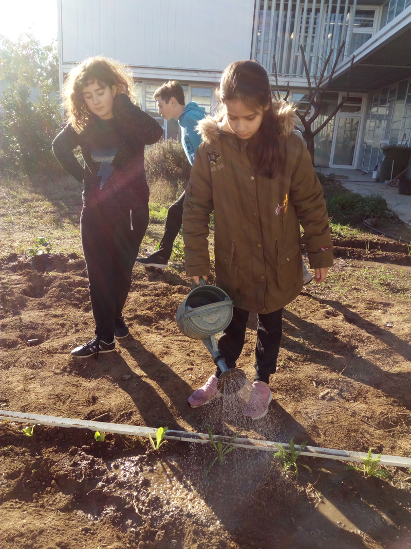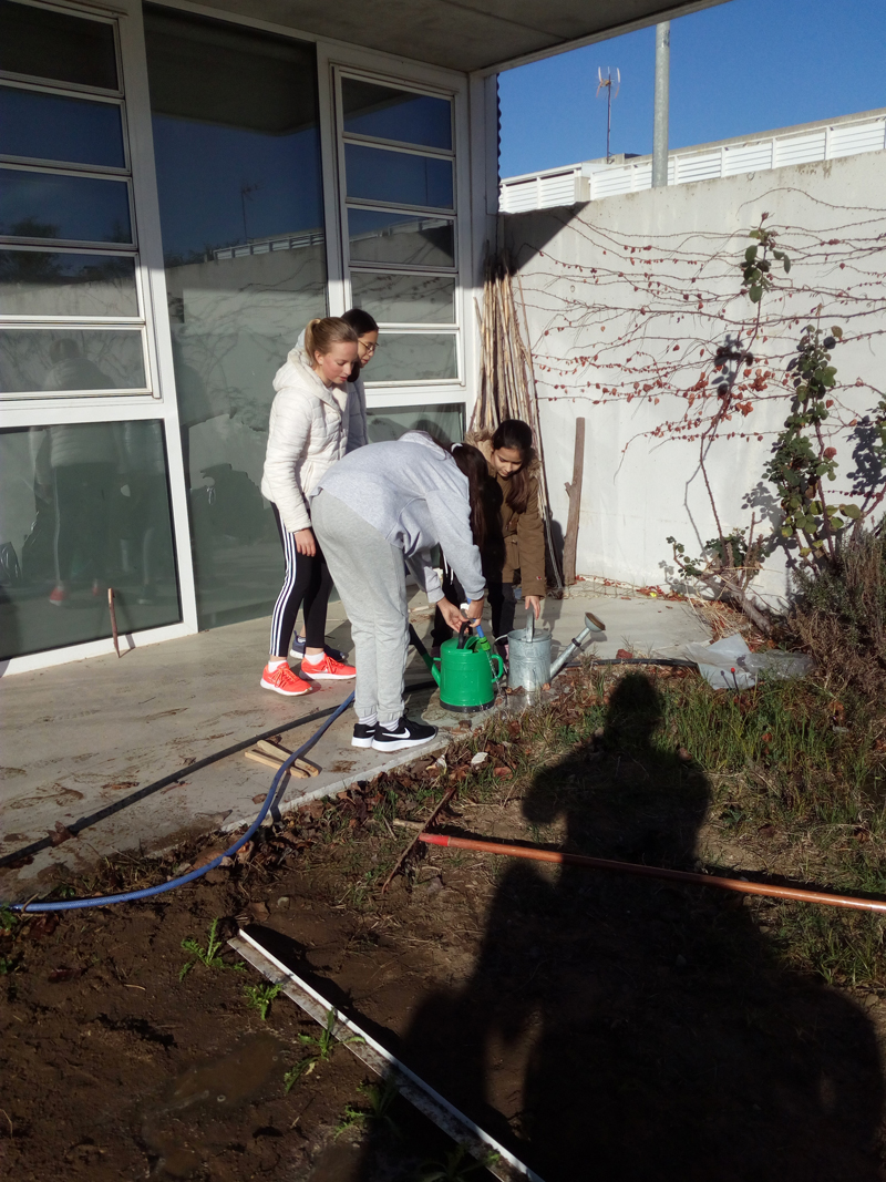 Divendres passat, l’alumnat de 1r d’ESO que cursa la matèria optativa d’Hort Ecològic, malgrat el fred, va sortir a l’hort a plantar verdures d’hivern: bròquils, cols, enciam del llarg, escarola i julivert. Feia tant de fred que a una part del pati no hi han pogut plantar res perquè el terra estava congelat i no han aconseguit cavar. Els alumnes han gaudit de l’activitat, tot i que alguns han comentat que prefereixen les maduixes a les verdures.