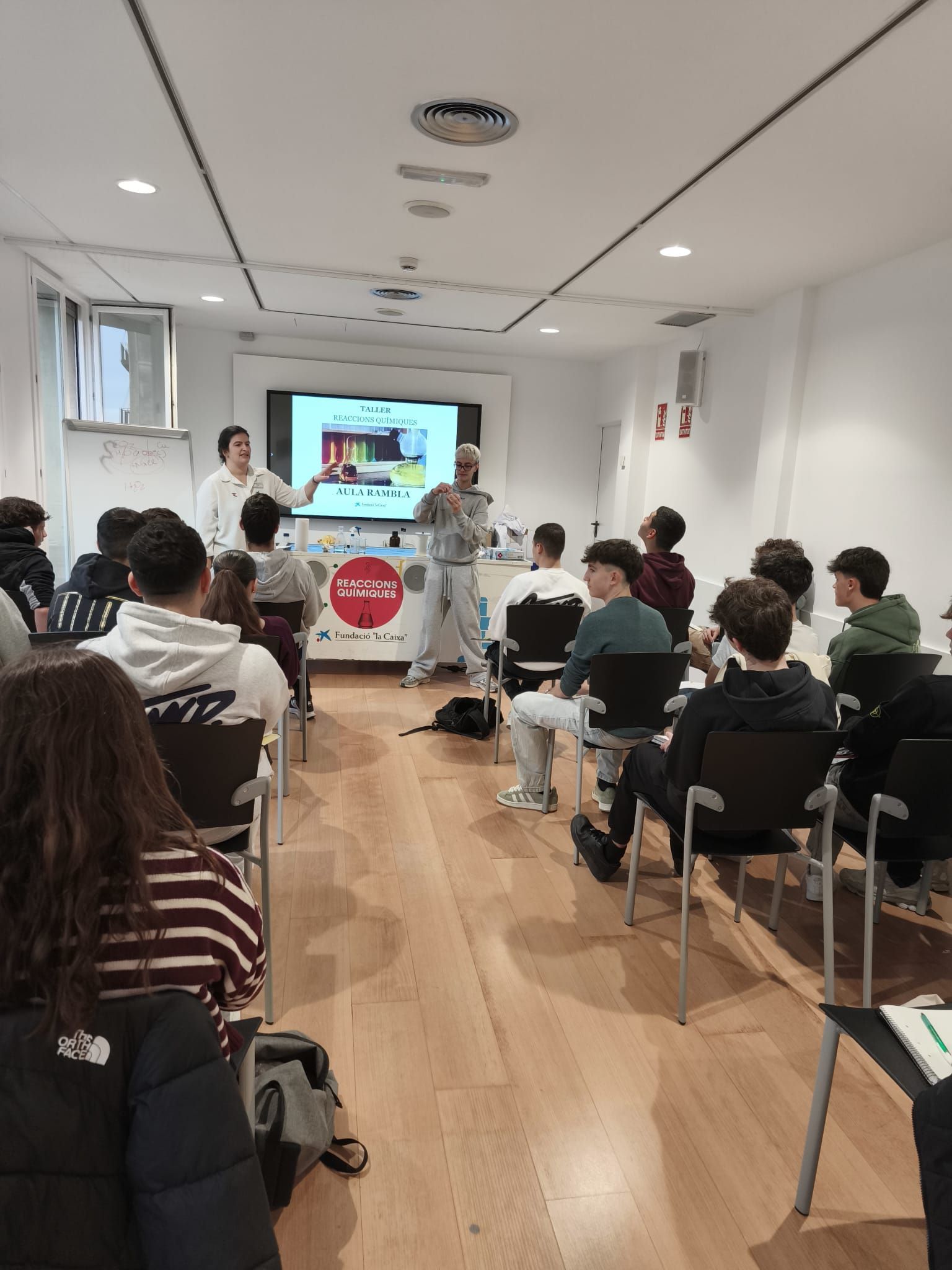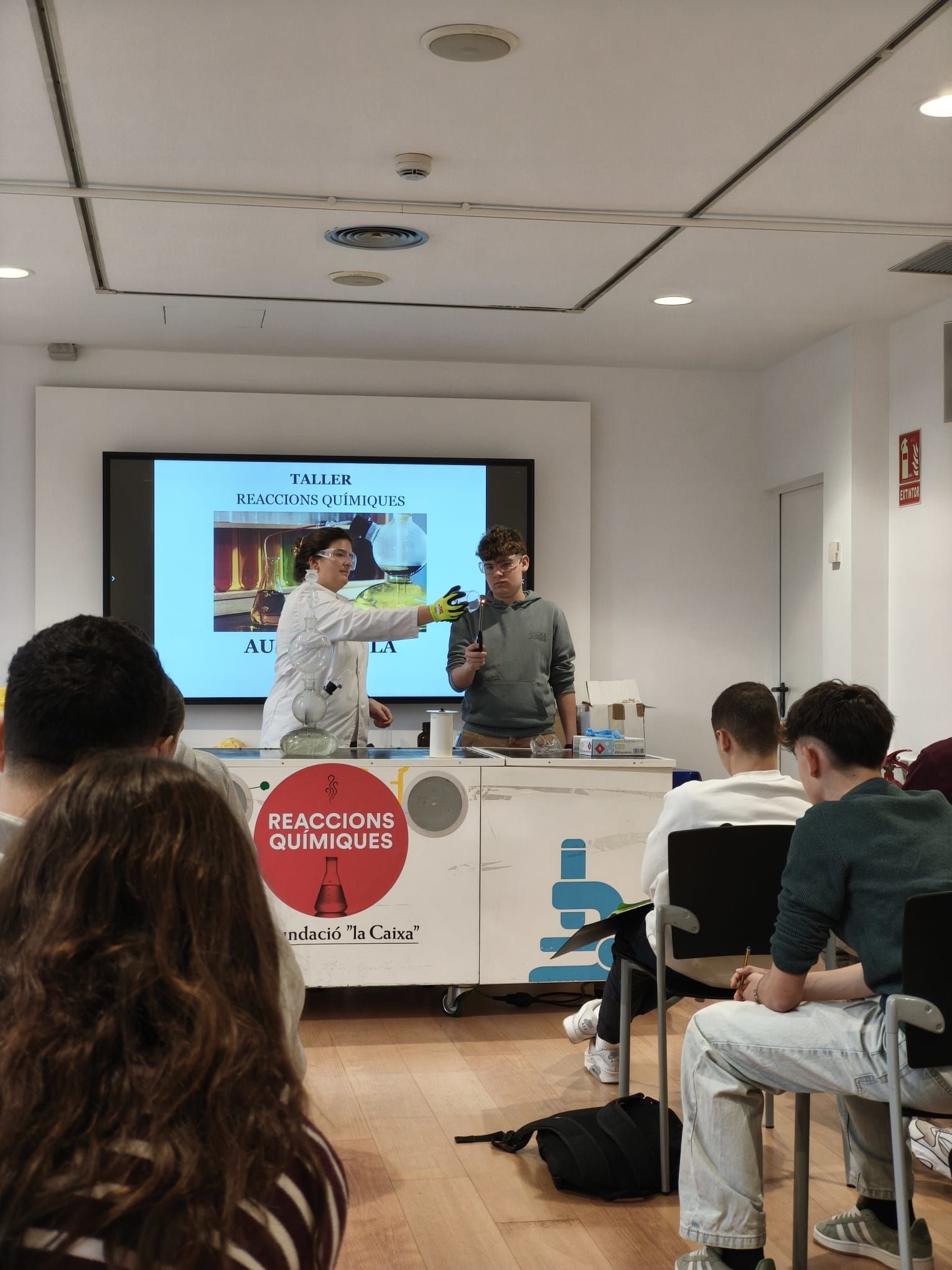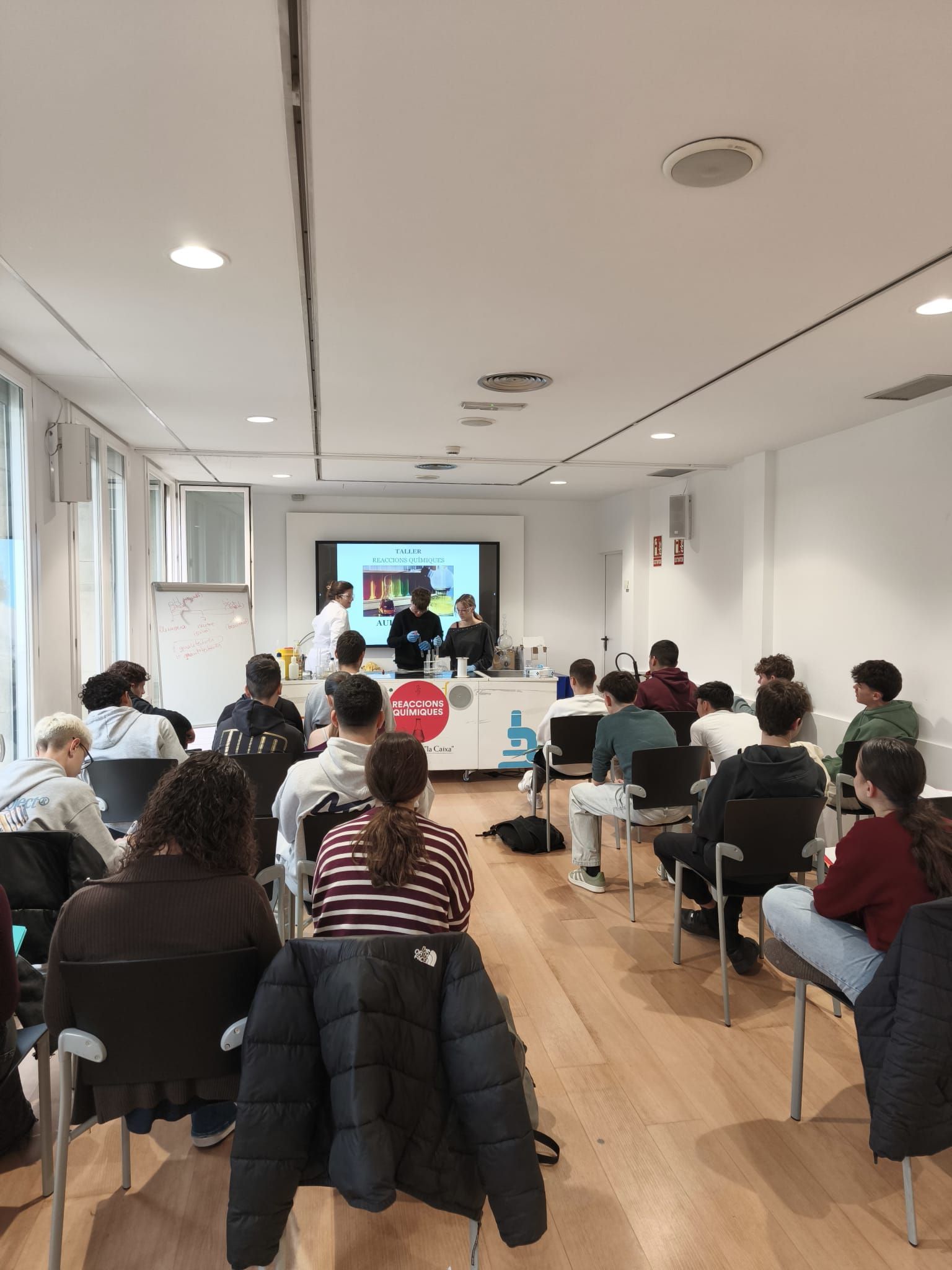L’alumnat de 4t d’ESO de l’assignatura de física i química va assistir el passat dimecres 4 de març al Caixaforum Tarragona per realitzar un taller de reaccions químiques. En primer lloc van repassar diferents conceptes com element, compost, substància pura, mescla homogènia, mescla heterogènia…i diversos materials de laboratori. Van poder veure com tenen lloc diferents reaccions químiques: exotèrmiques, endotèrmiques, de combustió, d’oxidació-reducció, de formació d’un gas, de neutralització…. Posteriorment van participar en una activitat tipus escape room relacionada amb la química.