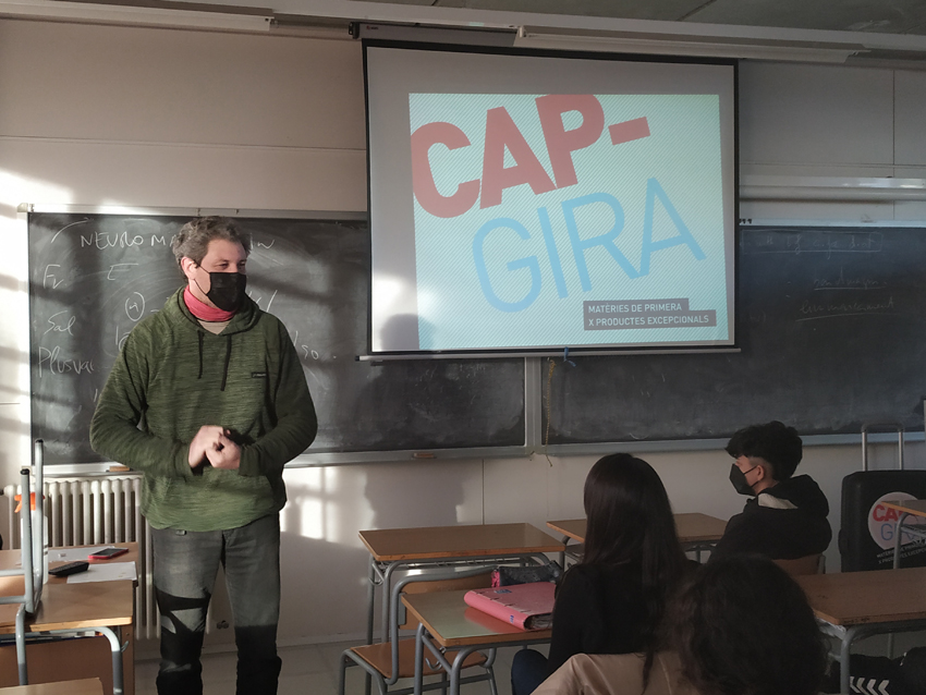 El passat dimecres 26 de gener l’alumnat de 1r de BAT va rebre l’Anton Aymemí i el seu taller “CAPgira: matèries de primera per a productes excepcionals”, una formació gens convencional sobre les possibilitats del reciclatge, associades a la innovació i l’emprenedoria. Productes únics com un casc fet de cartró reciclat, unes sabates fetes amb mangos que no són prou macos per vendre’ls, o una dessuadora feta amb marro de cafè… veure per creure. Vam tenir l’oportunitat de veure i tocar el potencial del que habitualment considerem deixalles.