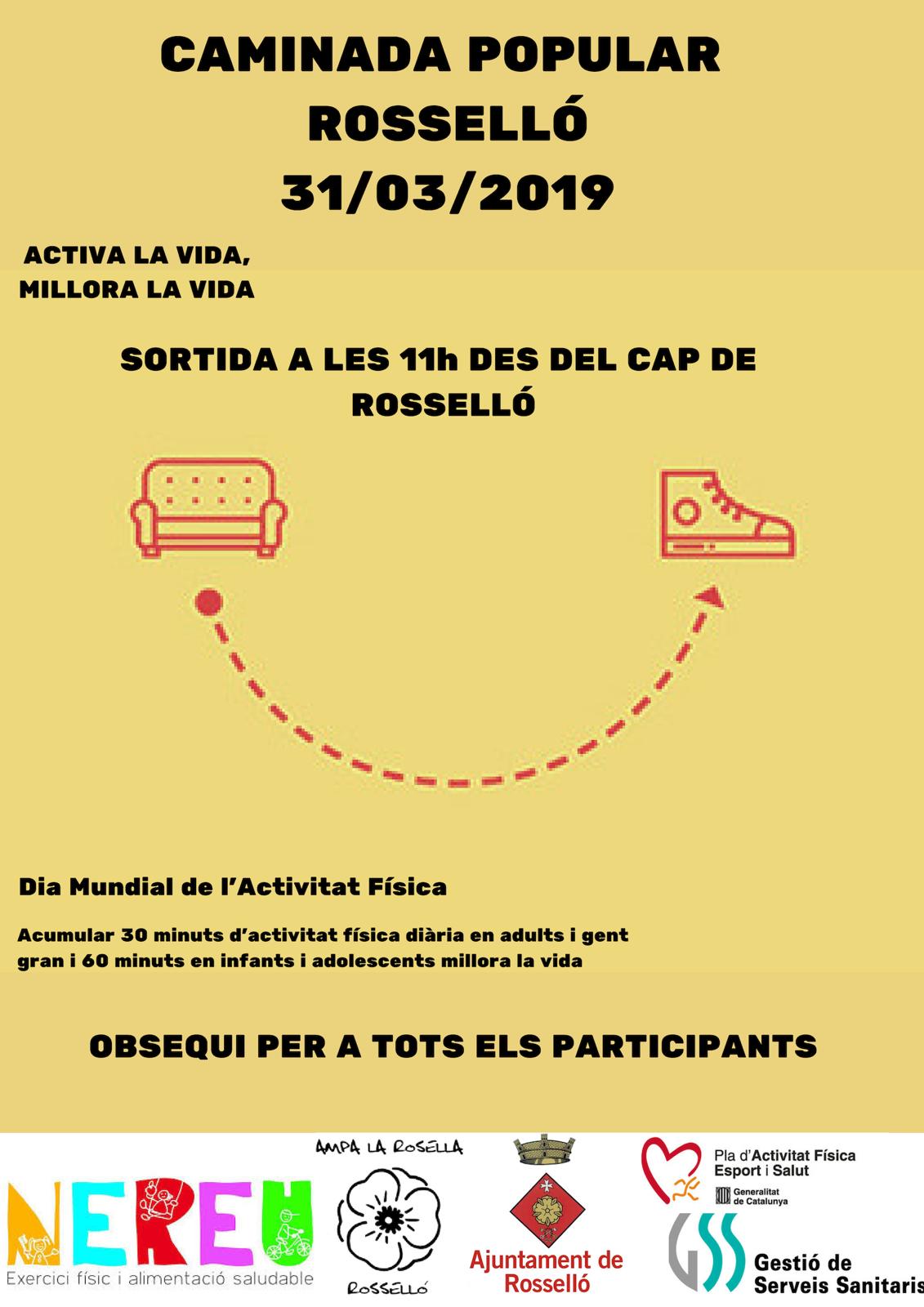 L’equip de pediatria del consultori de Rosselló-Torrefarrera us convida aquest diumenge dia 31 A LES 11H a la caminada popular que es realitzarà al municipi de Rosselló (DAVANT DEL CONSULTORI) i està organitzada conjuntament amb el programa NEREU i l’ajuntament de Rosselló amb l’objectiu de promocionar l’activitat física i afegir-nos així a les activitats que s’aniran realitzant arreu el Dia Mundial de l’Activitat Física (6 abril).