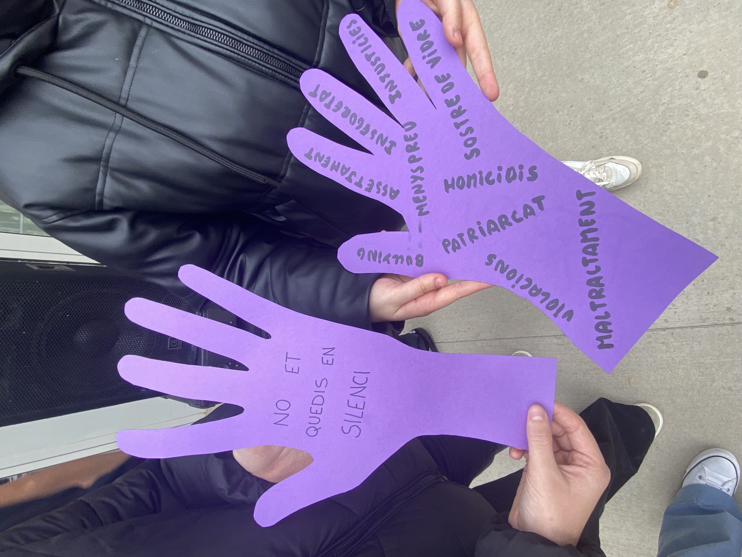 En primer lloc s’ha llegit el manifest elaborat per l’alumnat de Literatura Universal de 1r de Batxillerat i tot seguit, ha tingut lloc un minut de silenci per les víctimes de violència masclista. A continuació els representants de cada classe han llegit algunes de les frases anotades al revers d’unes mans gegants de color lila que l’alumnat havia treballat prèviament a tutoria.