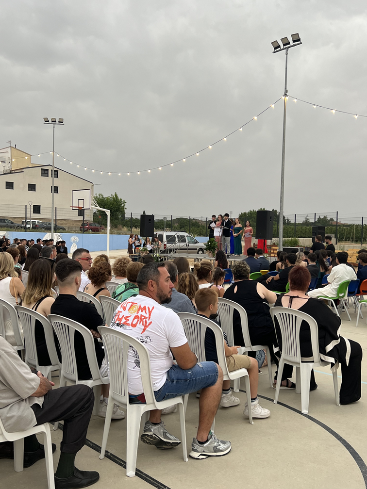 El passat dia 13 de juny, al pati de l’institut vam celebrar la festa de final de curs de 4t d’ESO. Sota un cel ennuvolat, amb l’amenaça d’una imminent  pluja estiuenca, ens vam reunir un bon grup de persones de la comunitat educativa de l’institut Joan Solà. D’una banda hi havia els protagonistes, és a dir, l’alumnat dels 4 grups de 4t d’ESO, tots ells mudats per l’ocasió, els quals estaven acompanyats per les seves famílies i amics, a banda  dels tutors i la resta de professorat del centre.