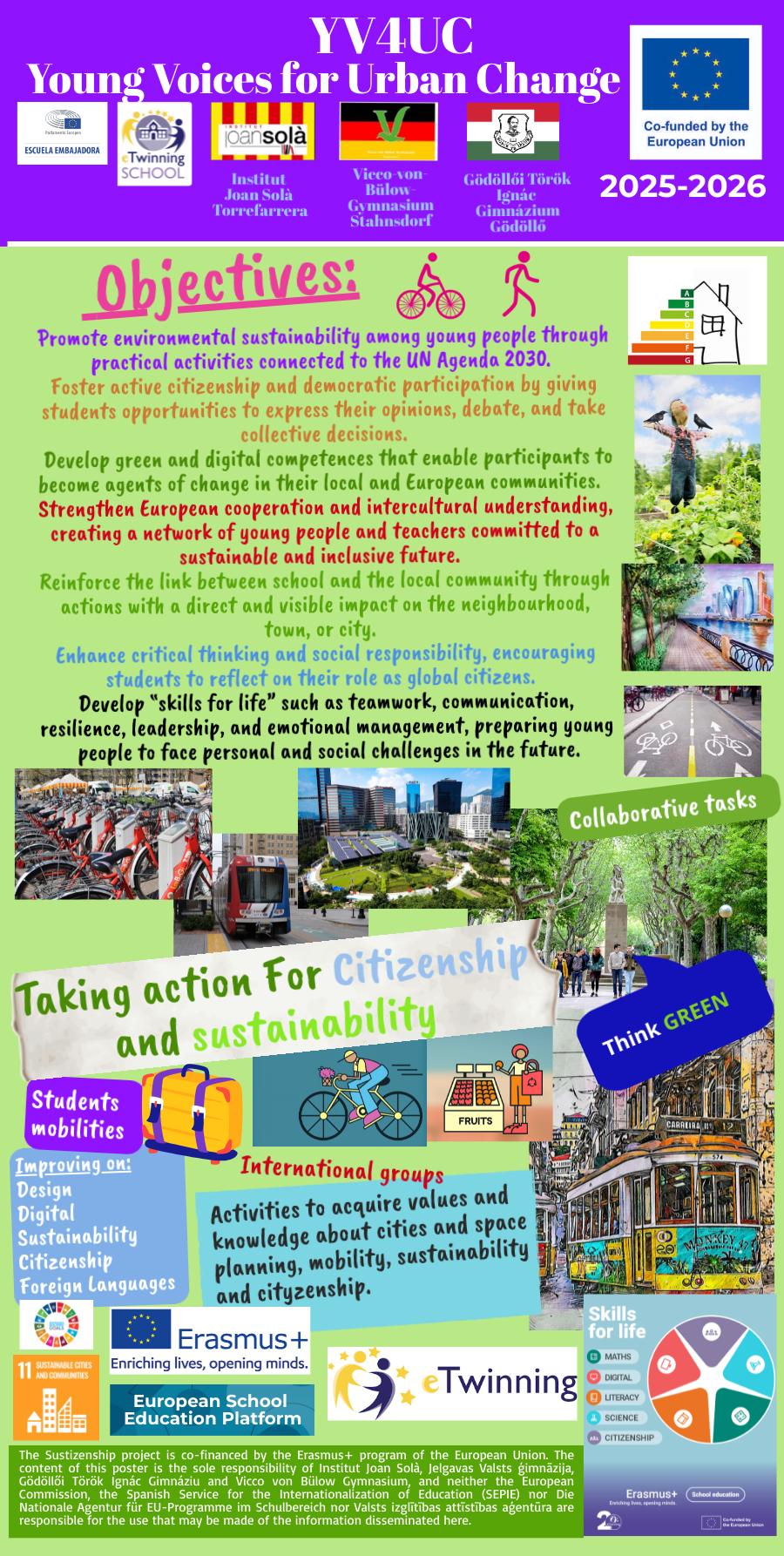 Estem iniciant les activitats del projectes Erasmus+ associat a mobilitats de grups a 4t ESO. El projecte eTwinning associat a Erasmus s’anomena Young Voices for Urban Change (YV4UC) (“veus joves pel canvi urbà”) on l’alumnat analitzarà la sostenibilitat i el disseny dels nostres pobles i ciutats, coneixerà iniciatives que es desenvolupen als municipis, i farà propostes de millora cap a unes ciutats millors. El projecte es treballa en llengua anglesa, i s’utilitzen les eines digitals de manera responsable. El projecte es treballarà utilitzant la plataforma eTwinning, fent tasques al seu TwinSpace, no només durant les mobilitats, també en línia quan no hi hagi les trobades.