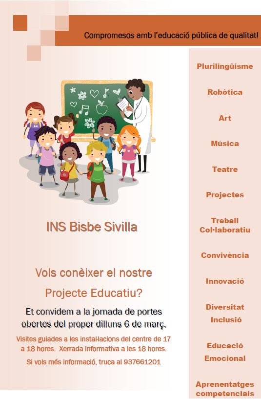 Portes obertes ESO 2023-2024: dilluns 6 de març Josep Mª Nogueras Hernàndez01/03/23 Dilluns 6 de març fem la jornada de portes obertes de l’ESO. De 17 a 18 hores visita a les instal·lacions i a les 18 hores xerrada informativa a la Sala d’Actes del centre.