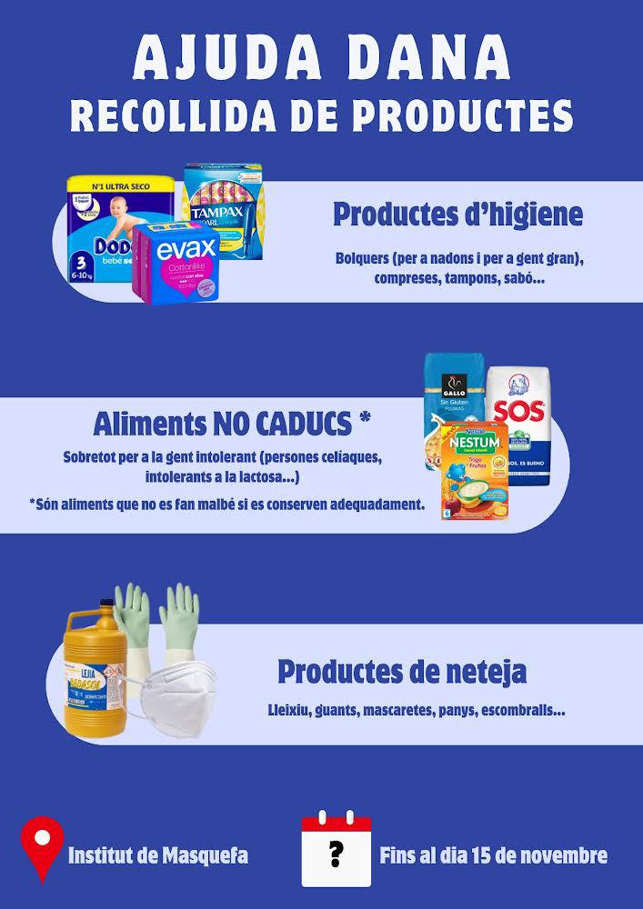 Aquesta setmana continua la recollida d’aliments i materials per a les persones afectades per la DANA a València. Recordeu que es podran lliurar fins al 15 de novembre a l’Institut de Masquefa.