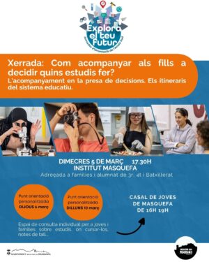 Us informem que des de l’Institut de Masquefa i l’Ajuntament us volem donar a conèixer els recursos i serveis que poden ser del vostre interès per l’acompanyament als vostres fills i filles en la tria dels estudis postobligatoris, més enllà de les accions previstes en horari lectiu.