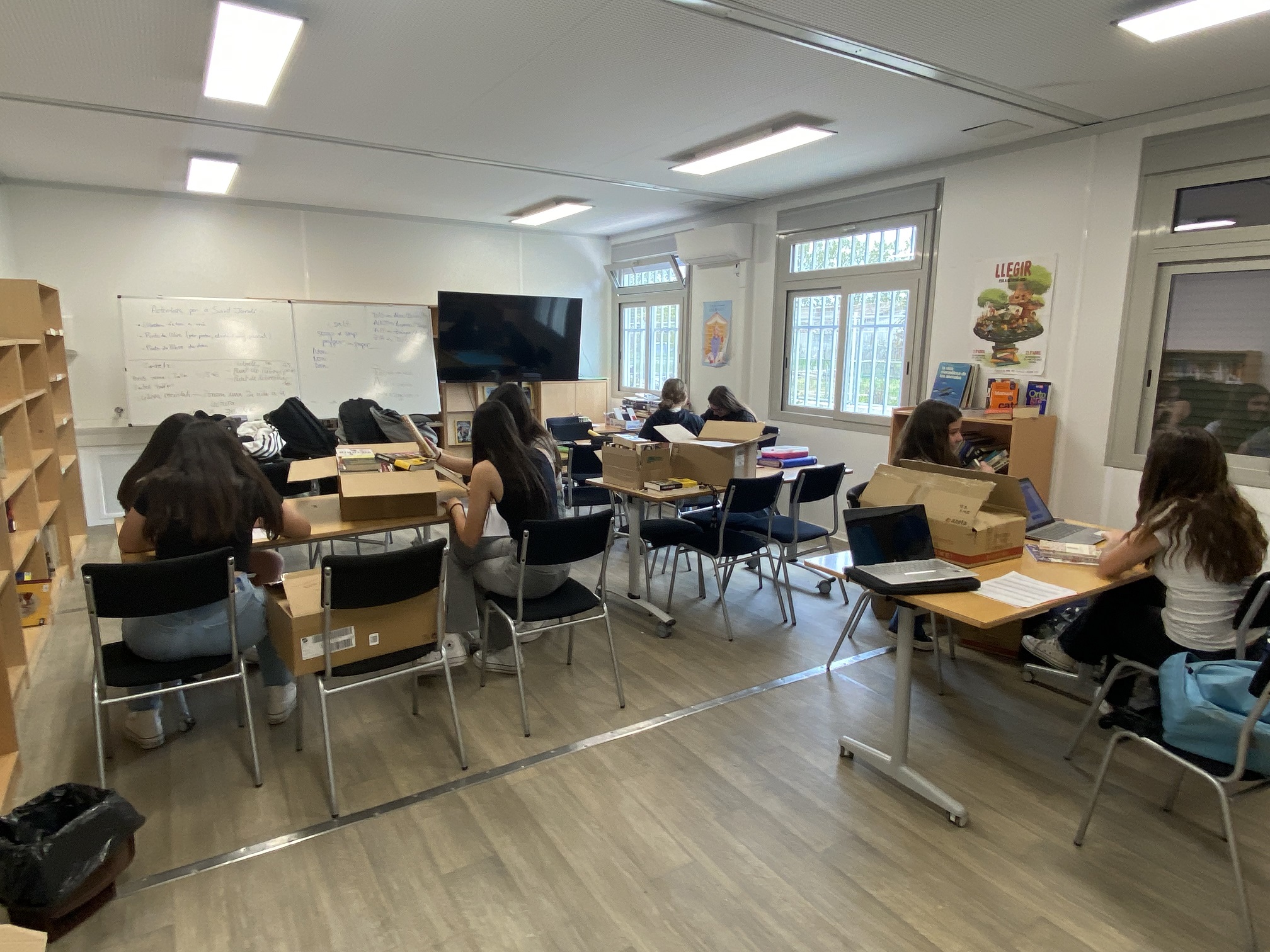 Alumnat de 3r d’ESO ultimant els preparatius de les parades de Sant Jordi. Els diners que recaptin seran per començar a fer guardiola pel viatge de final d’etapa del curs vinent..