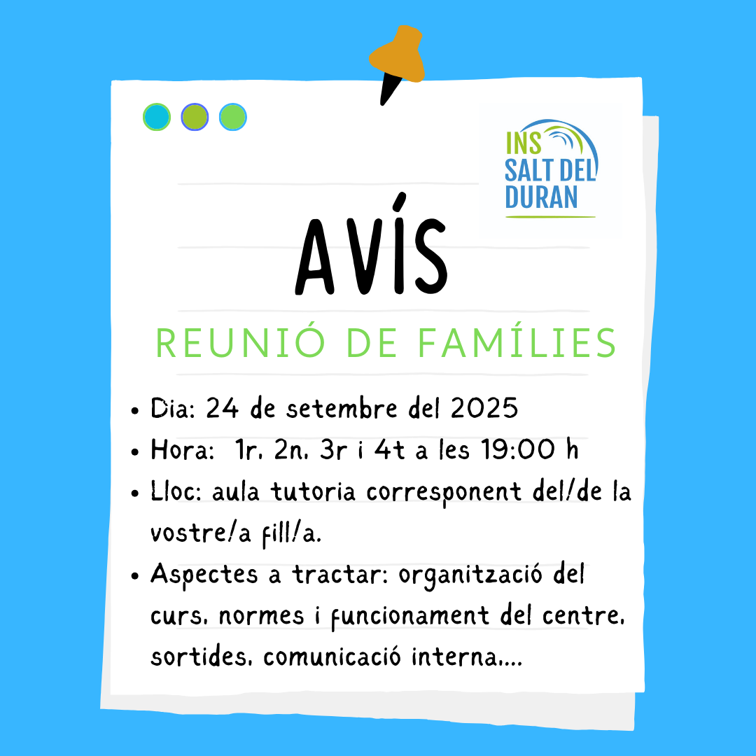 Us informem que el dimecres 24 de setembre de 2025, a les 19.00 h, se celebrarà la reunió de famílies dels cursos de 1r, 2n, 3r i 4t d’ESO.