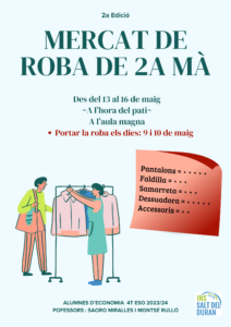 Des de l’assignatura d’Economia de 4t d’ESO amb els professors Saoro Miralles i Montse Rulló, estem organitzant un mercat de roba de segona mà. El mercat es durà a terme a l’Aula Magna a les hores del pati del 13 al 16 de maig. En aquest mercat, l’alumnat podrà gaudir de diferents peçes de roba de segona mà. Cada alumne que tingui una peça de roba, que ja no utilitza, la podrà portar i intercanviar-la per altres que li puguin fer servei. És necessari que totes les peces estiguin en bon estat. Per cada peça de roba que l’alumne porti es bescanviarà per uns punts amb els que més tard podrà adquirir aquelles peces que vulgui.