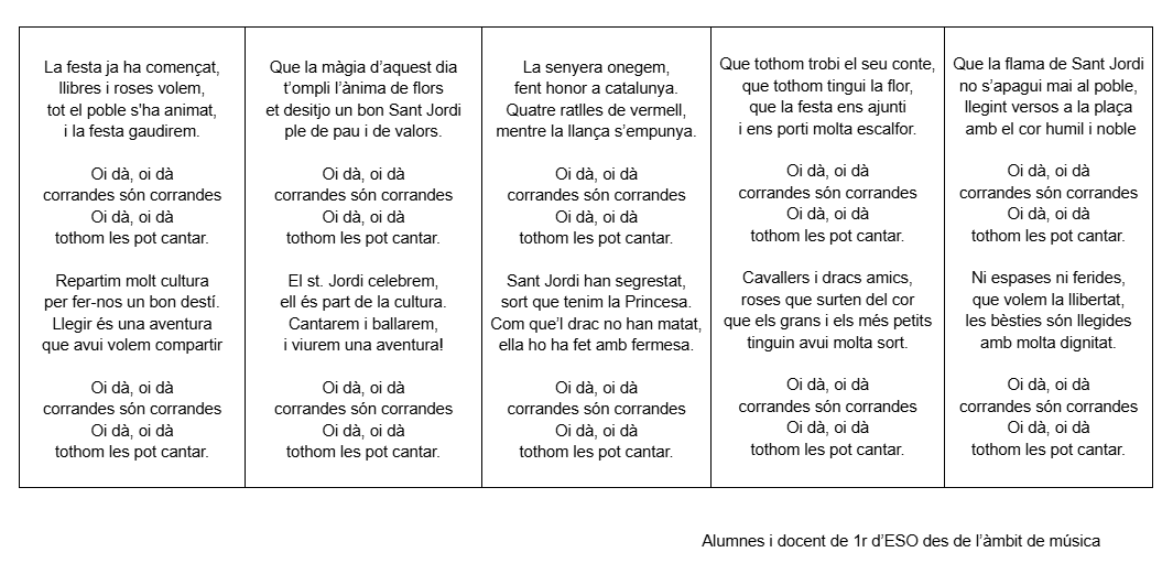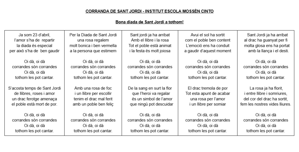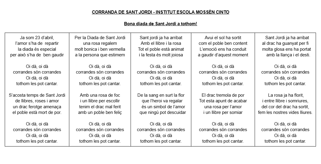 els alumnes de 1r d’ESO, des de l’àmbit de música, hem estat preparant una Corranda per celebrar la Diada de Sant Jordi i us la volíem compartir amb tots/es vosaltres. Esperem que us agradi i la gaudiu!