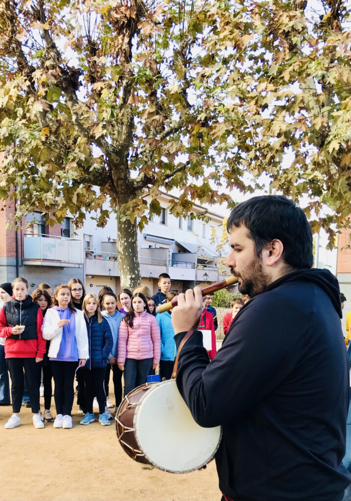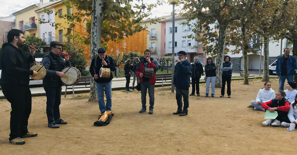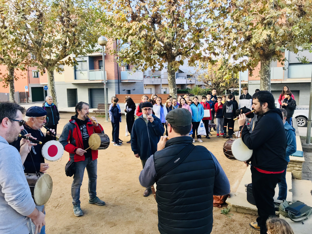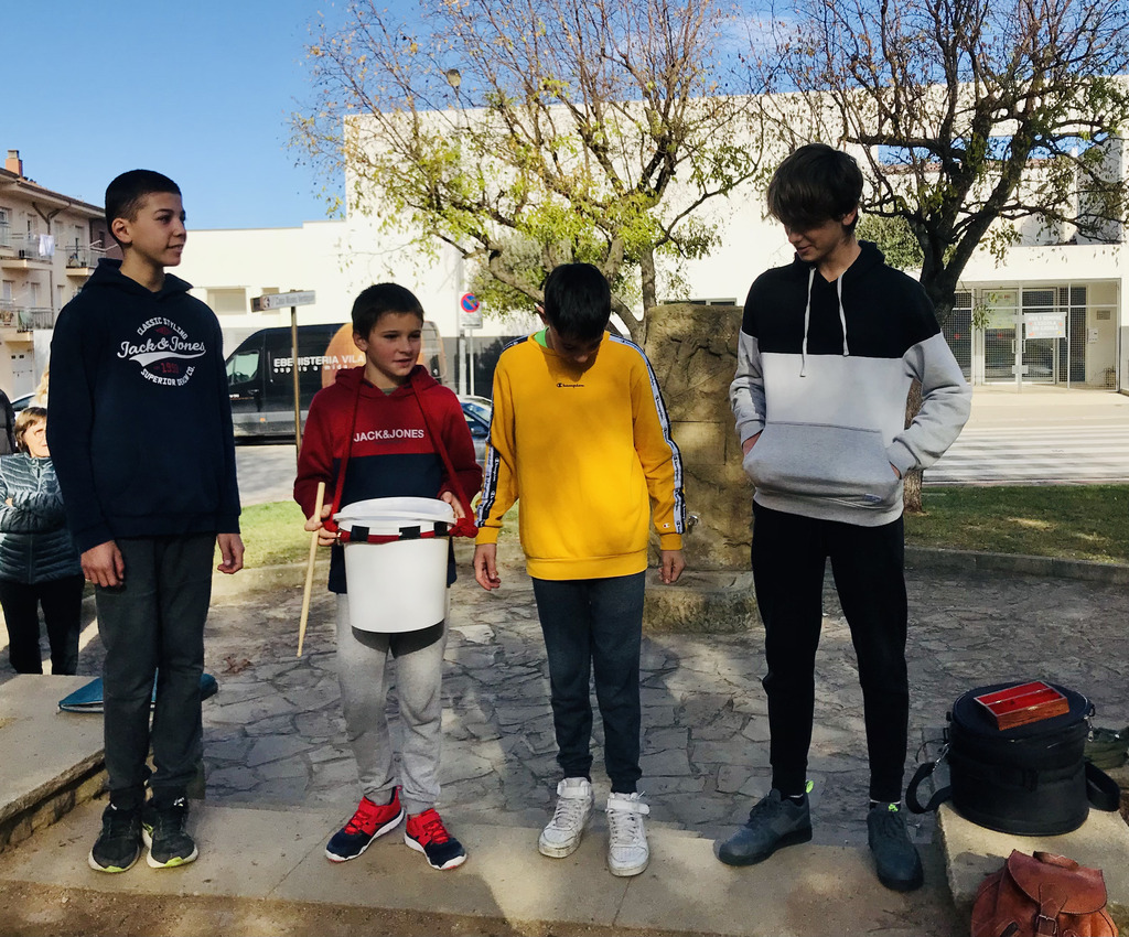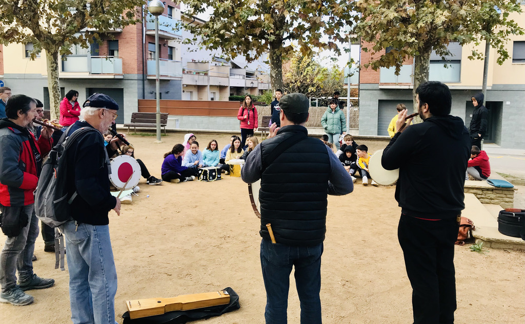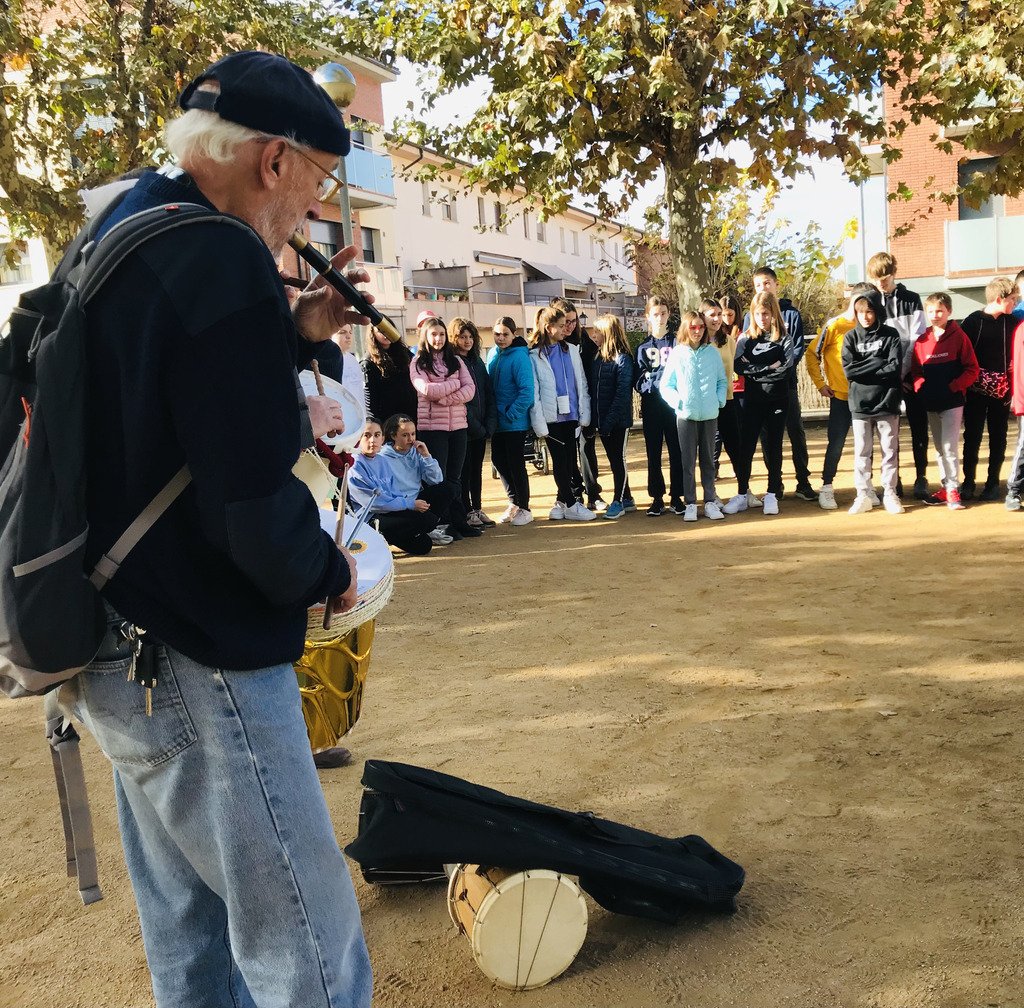 Els flabiolaires ens van oferir un bonic concert amb cançons del repertori d’en Roviretes i també versions d’alguna cançó actual. El que va fer especial aquesta trobada va ser que toquéssin alguns d’aquests temes amb els instruments de percussió que l’alumnat de 1r d’ESO va construir. D’aquesta manera, després de les presentacions per part de les noies i els nois de 1r d’ESO, els flabiolaires professionals van buscar la forma més òptima de col·locació a l’hora de tocar cada instrument i també van explorar totes les possibilitats sonores. Així van poder fer un bon retorn a cada grup, aportant propostes de millora i accentuant els punts forts de cada instrument.