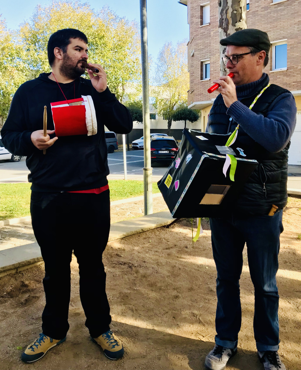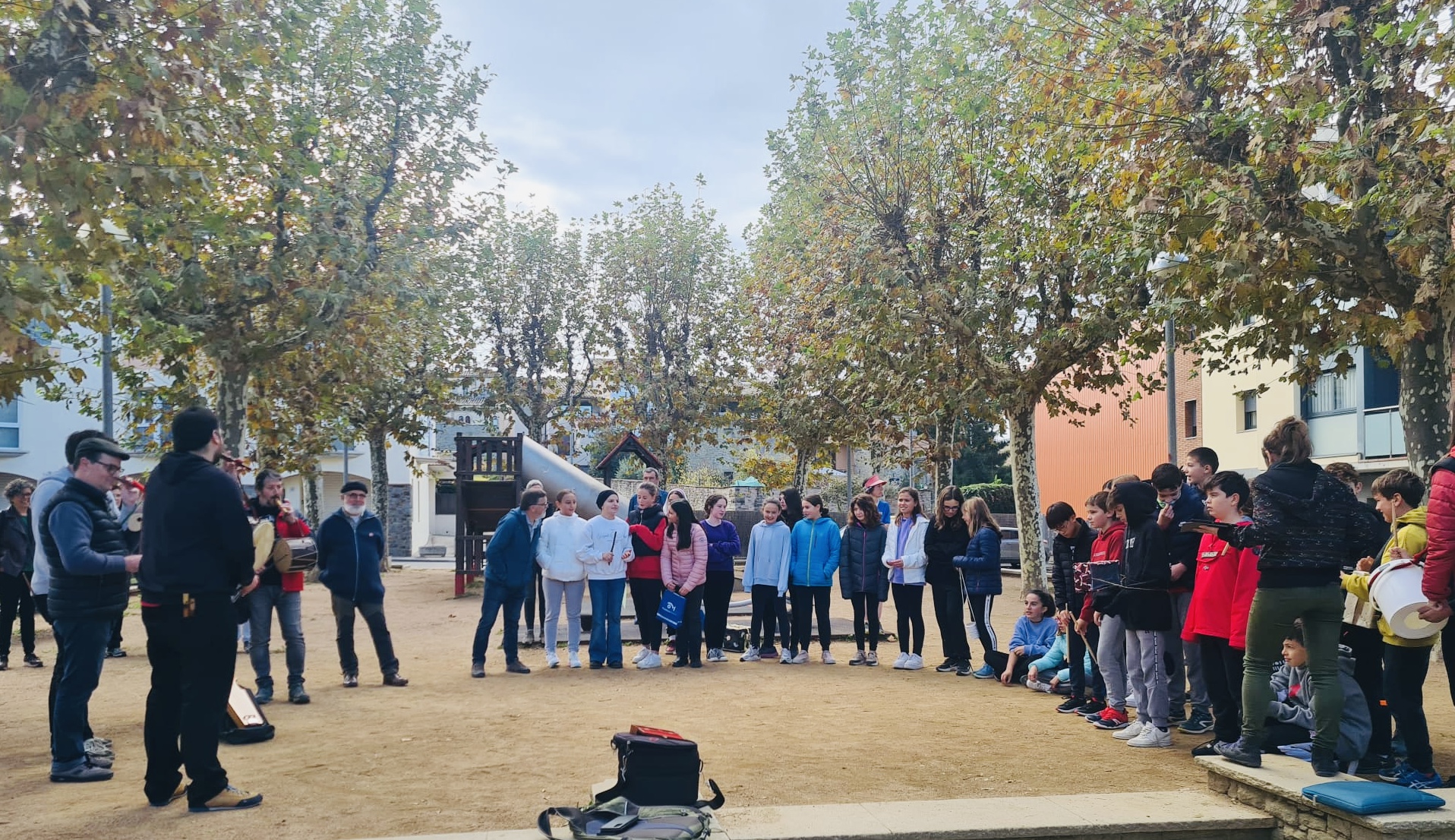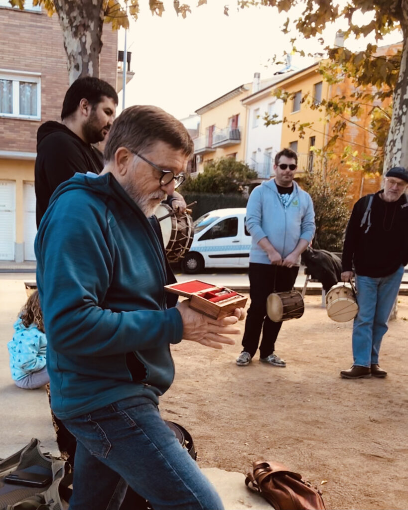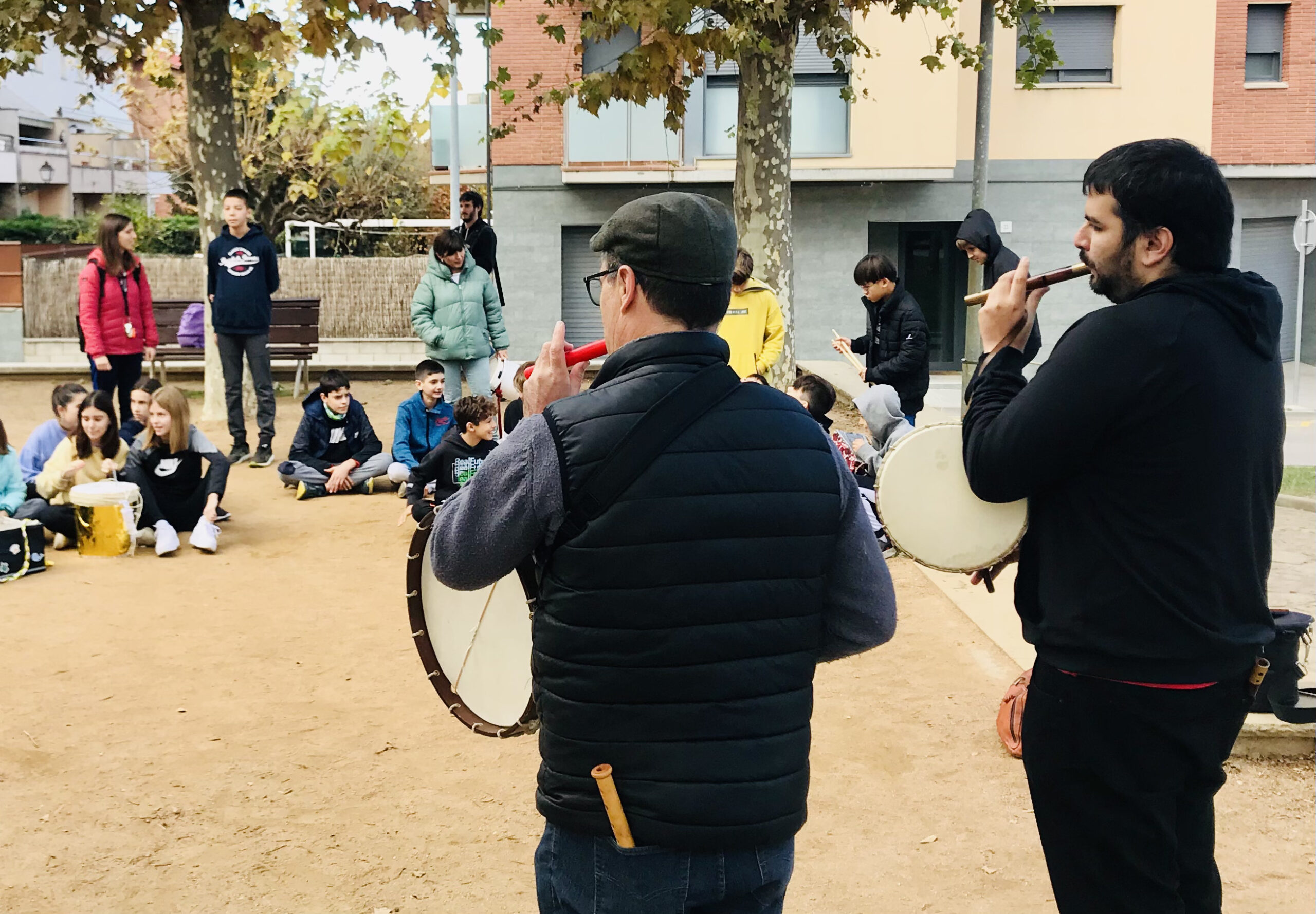 Els flabiolaires ens van oferir un bonic concert amb cançons del repertori d’en Roviretes i també versions d’alguna cançó actual. El que va fer especial aquesta trobada va ser que toquéssin alguns d’aquests temes amb els instruments de percussió que l’alumnat de 1r d’ESO va construir. D’aquesta manera, després de les presentacions per part de les noies i els nois de 1r d’ESO, els flabiolaires professionals van buscar la forma més òptima de col·locació a l’hora de tocar cada instrument i també van explorar totes les possibilitats sonores. Així van poder fer un bon retorn a cada grup, aportant propostes de millora i accentuant els punts forts de cada instrument.
