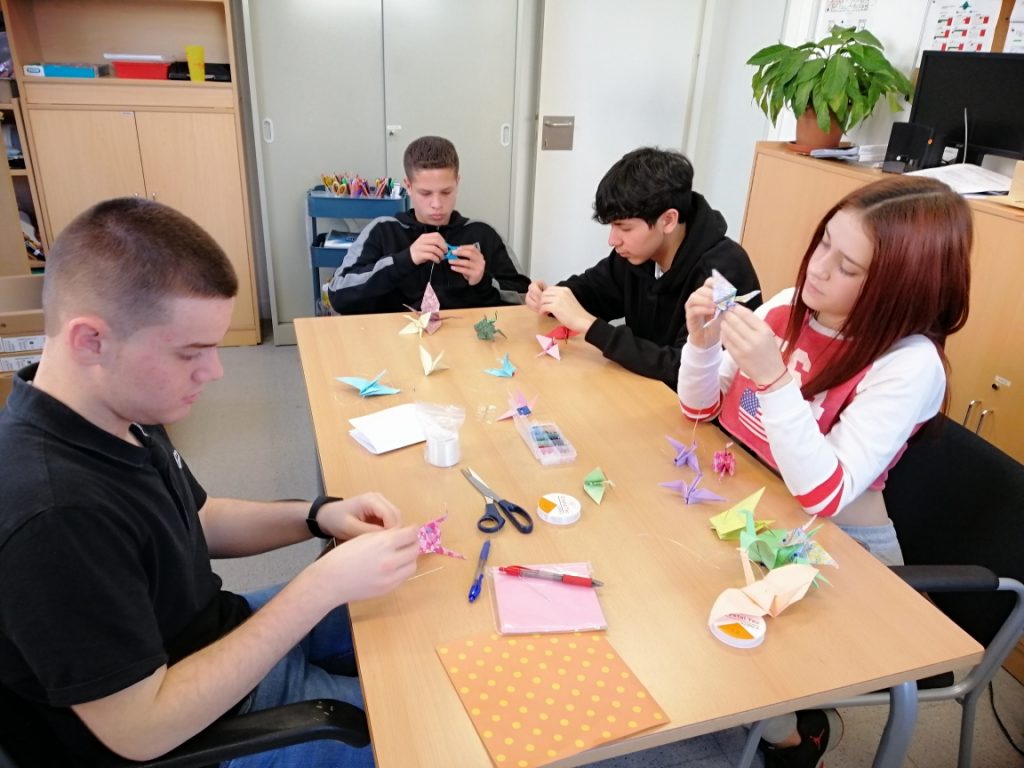 Vam fer un seguit d’activitats per fomentar la convivència i la pau. A partir de la història de Sadako Sasaki vam parlar sobre els conflictes bèl·lics i vam decidir realitzar col·lectivament 1000 grues que simbolitzen el nostre desig simbòlic perquè acabin les desigualtats en el món i tinguem relacions pacífiques.