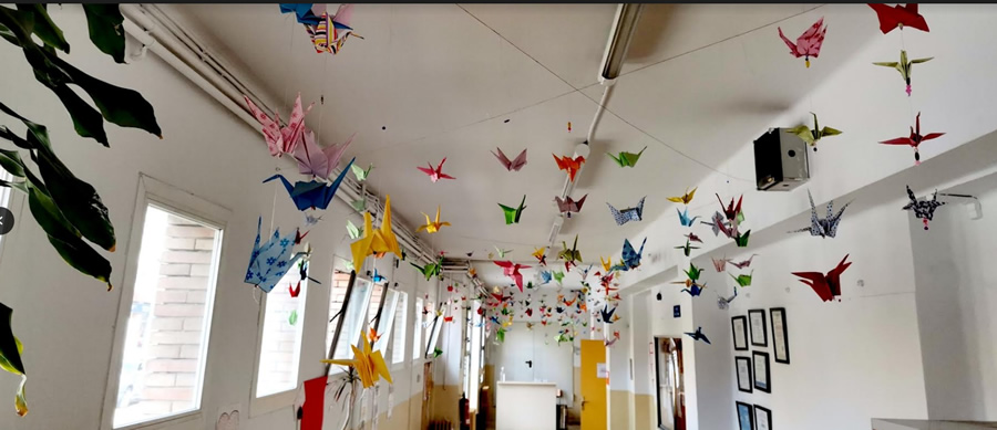 Per commemorar el dia de la Pau i la no-violència l’alumnat de 1r d’ESO de l’institut Marta Estrada va fer unes grues per recordar la història de Sadako i les mil grues. La història de Sadako ens explica que a conseqüència de les radiacions de la bomba d’Hiroshima va patir una greu malaltia i va estar ingressada a l’hospital.Quan era petita li van explicar que si construïa mil grues se li compliria un desig.