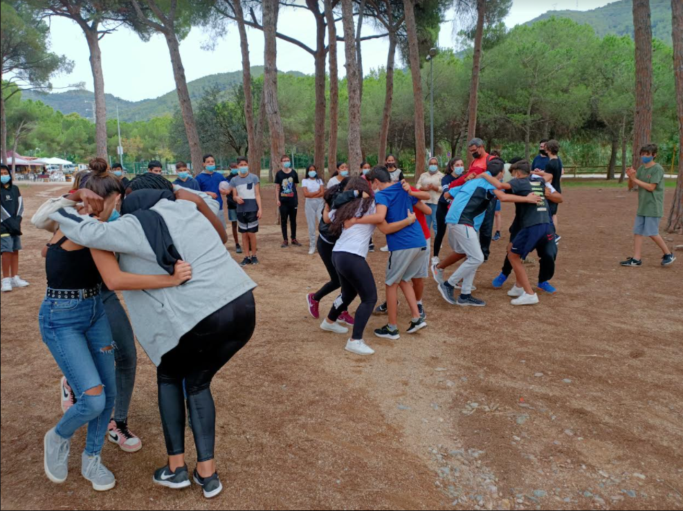 La primera activitat consistia a fer una cursa en grups de quatre alumnes. Cada grup havia de portar un globus agafat amb el cap d’un punt fins la meta. A la següent activitat fam fer una cursa, també en grups de quatre, però amb els peus lligats entre nosaltres. Finalment vam fer una competició d’avions de paper entre classes, i els que volaven més lluny sumaven punts. Per últim, vam construir un a estructura humana amb tot el grup classe.