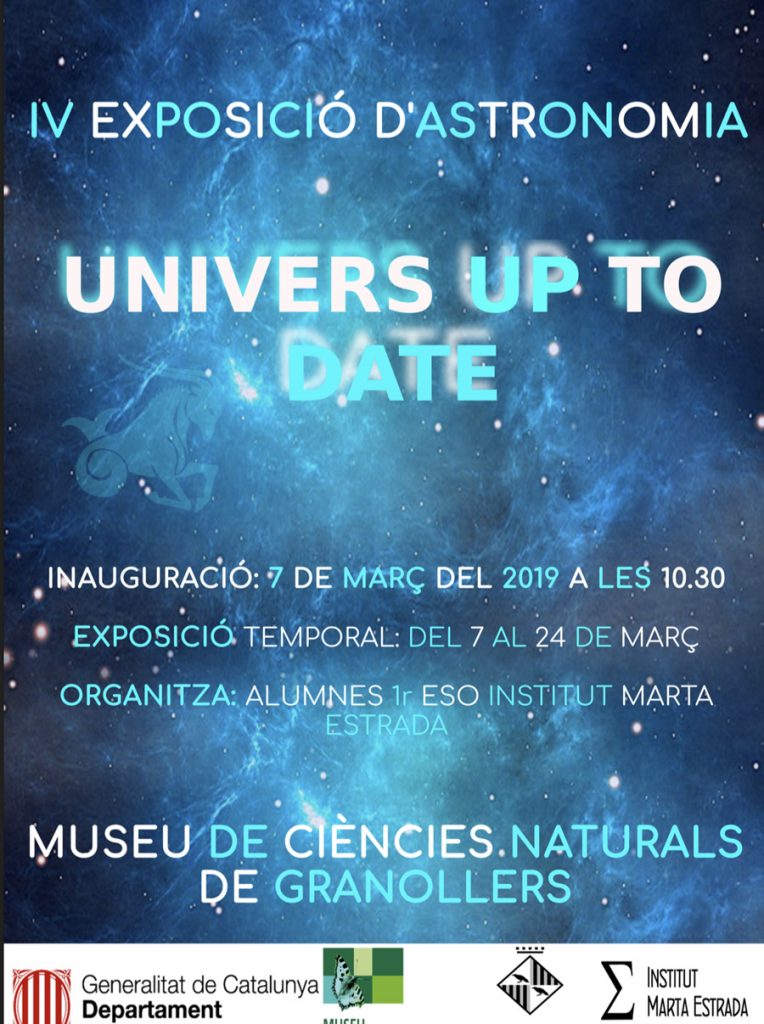 Ja està inaugurada al Museu de Ciències La Tela, de Granollers, l’exposició Universes Up to date, preparada per l’alumnat de 1er d’ESO com a part del seu projecte globalitzat del segon trimestre. L’exposició estarà visitable durant unes setmanes, us convidem a capbussar-vos en la profunditat de l’Univers.