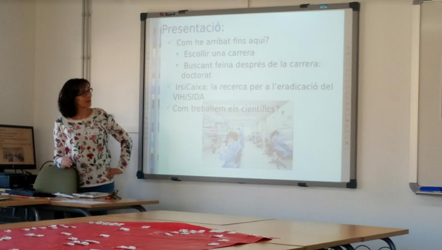 En primer lloc, van haver-hi les ponències: les investigadores Irma Roig (del Centre de Regulació Agro-Genòmica, CRAG) i Mari Carmen Puertas (del centre de recerca sobre la SIDA, IRSI-Caixa) ens van presentar el seu itinerari vital fins a ser investigadores i en què consisteix la seva tasca.