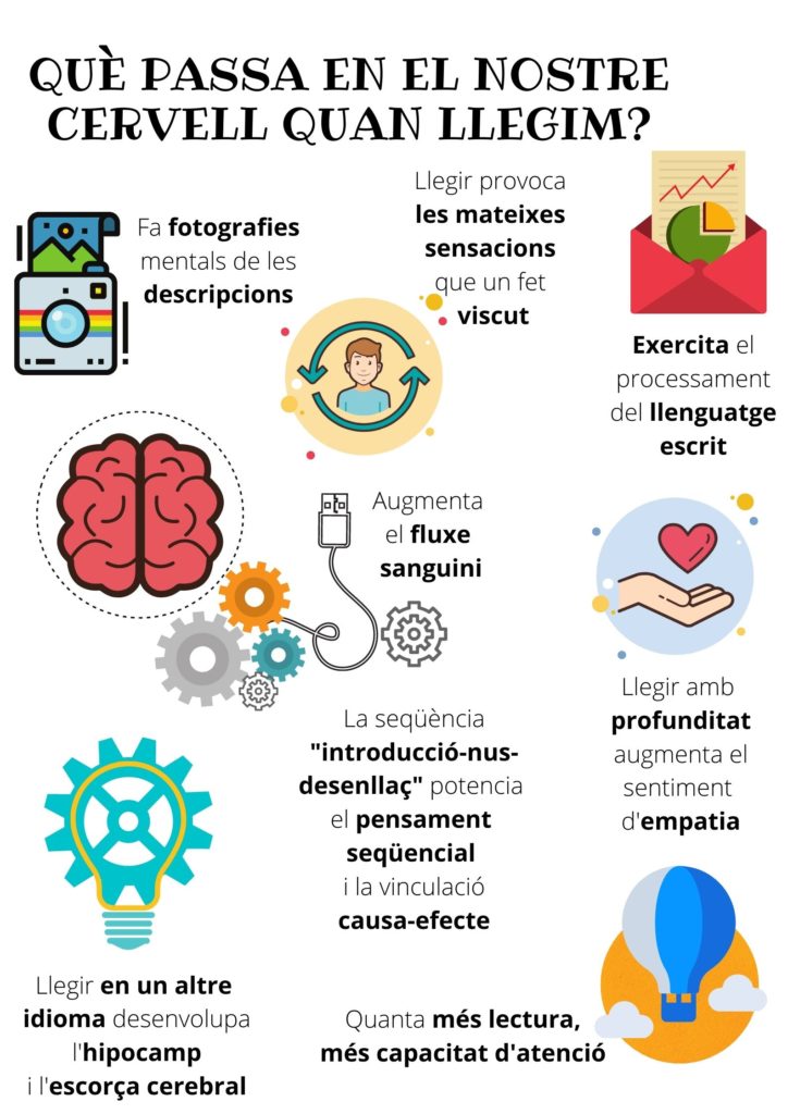 La lectura i el nostre cervell Feu un comentari / Per Biblioteca / 01/03/2021 / Novetats Resulta interessant veure quins efectes provoca la lectura al nostre cos, concretament, al nostre cervell. A continuació, se’n fan cinc cèntims. Quines altres sensacions vivim mentre llegim?