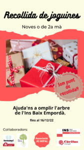 Enguany, i com a segon any consecutiu, l’Institut La Sureda col·labora com a punt de recollida de joguines noves o de segona mà. Des de l’Institut Baix Empordà va sorgir la iniciativa de recollir joguines en col·laboració amb l’associació JO NEPAL i també amb CÀRITES per tal de que les joguines arribin a tots els nens i nenes. Nosaltres un any més som un punt de recollida i des de l’Ins Baix Empordà s’encarreguen d’organitzar, embolicar i emmagatzemar els paquets fins que surtin cap el seu destí. Així que si teniu joguines en bon estat que estan agafant pols ara és un bon moment per fer espai a casa i donar-los-hi una segona vida. Teniu temps fins el 16 de desembre.