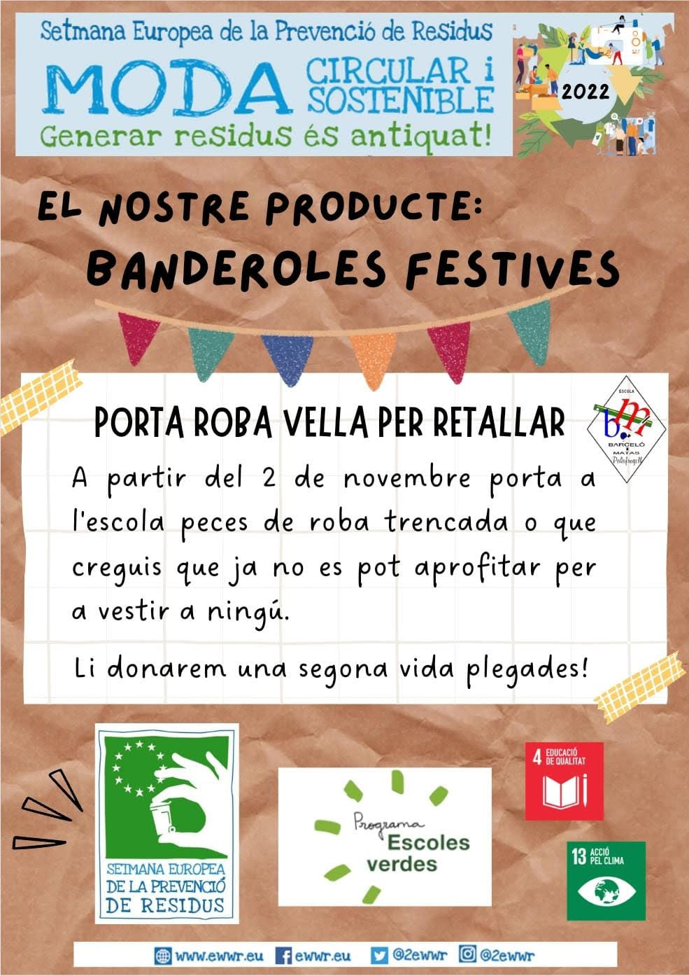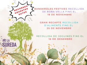 D’altra banda també ens sumem a dues iniciatives més. La primera és una recollida de roba vella que servirà per fer banderoles festives i que s’ha organitzat amb motiu de la Setmana Europea de la Prevenció de Residus. Teniu temps de portar la roba fins el divendres 18 de novembre. La segona és el GRAN RECAPTE D’ALIMENTS que coma