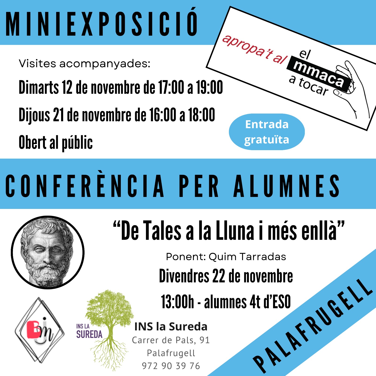 Ens plau compartir amb vosaltres que de l’11 al 22 de novembre tindrem a l’Institut La Sureda una miniexposició del MMACA (Museu de Matemàtiques de Catalunya). Els nostres alumnes visitaran l’exposició per grups classe i l’alumnat de 4t d’ESO gaudirà de la xerrada “De Tales a la Lluna i més enllà” que ens ofereixen des del MMACA.