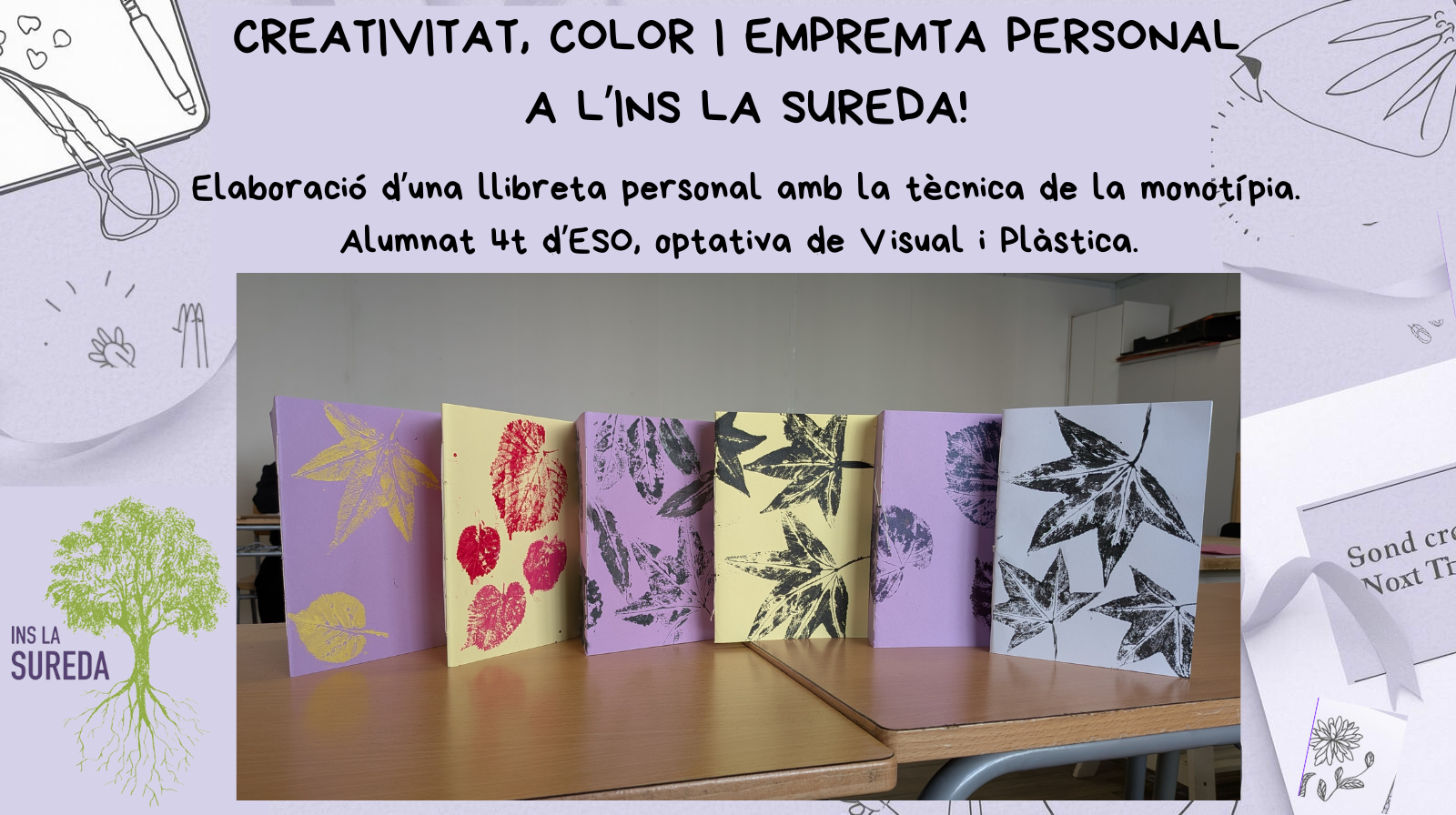 Des de l’optativa de Visual i Plàstica de 4t d’ESO us compartim algunes imatges del procés creatiu i del resultat final del projecte que hem estat treballant a l’aula. L’alumnat ha elaborat la seva pròpia llibreta des de zero, començant amb un enquadernat artesanal cosit amb fil. Un cop enllestida l’estructura, han decorat la portada i la contraportada amb la tècnica de la monotípia – una estampació única feta amb elements naturals com fulles i flors. El resultat són llibretes plenes de color, textura i personalitat. Alguns treballs han quedat realment espectaculars! #VisualiPlàstica#MonotípiaCreativa#INSLaSureda