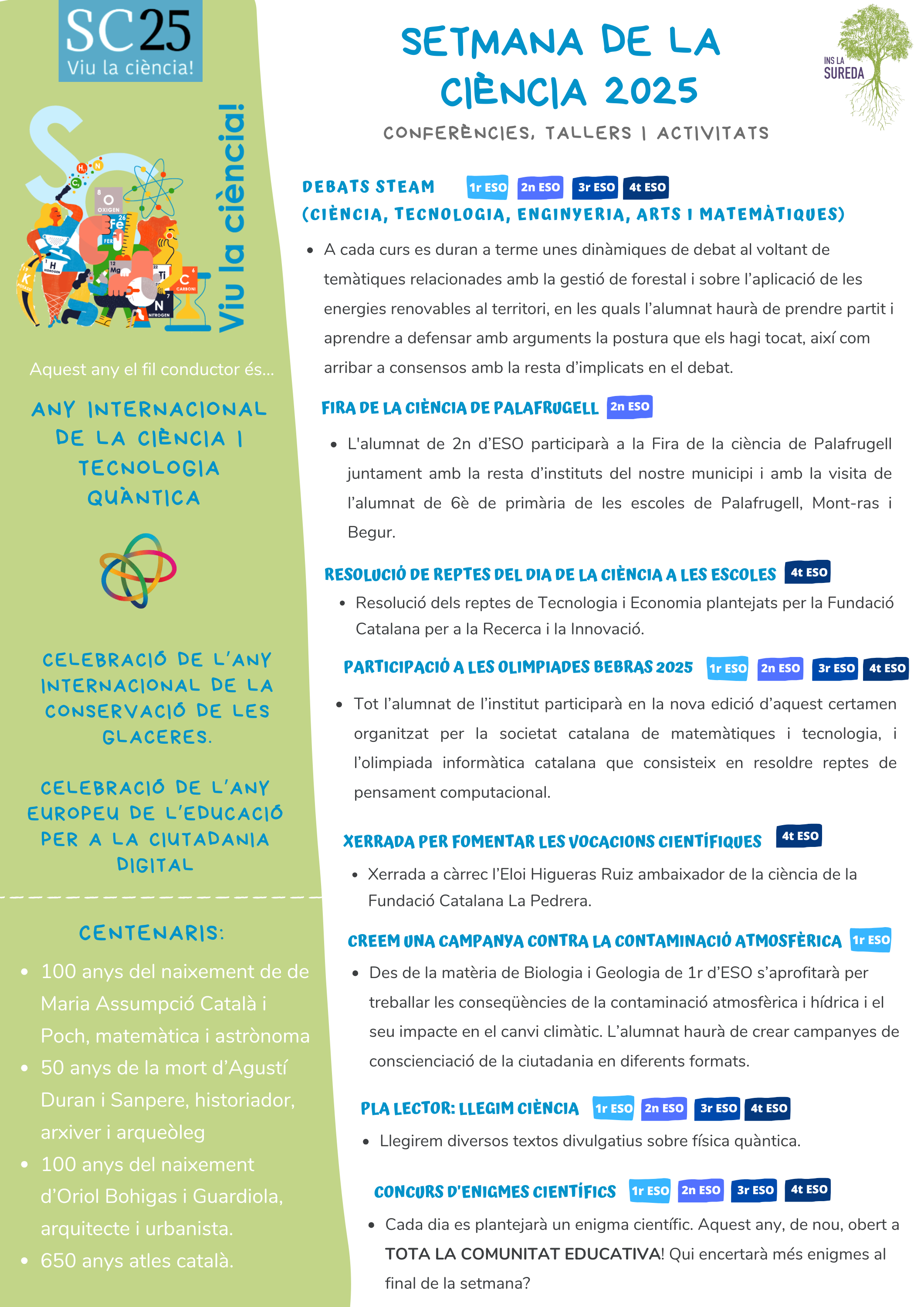 A més, tal com ja hem fet en anteriors edicions, tornem a celebrar el Concurs d’Enigmes Científics amb tres categories; 1r i 2n d’ESO, 3r i 4t d’ESO i Comunitat Educativa. Aquesta darrera categoria és oberta a tothom (famílies, professorat, PAS…) i us animem a participar-hi per optar a guanyar els premis que tenim preparats. Podreu consultar els 5 enigmes als passadissos de l’institut, a l’Instagram del centre i a la web.