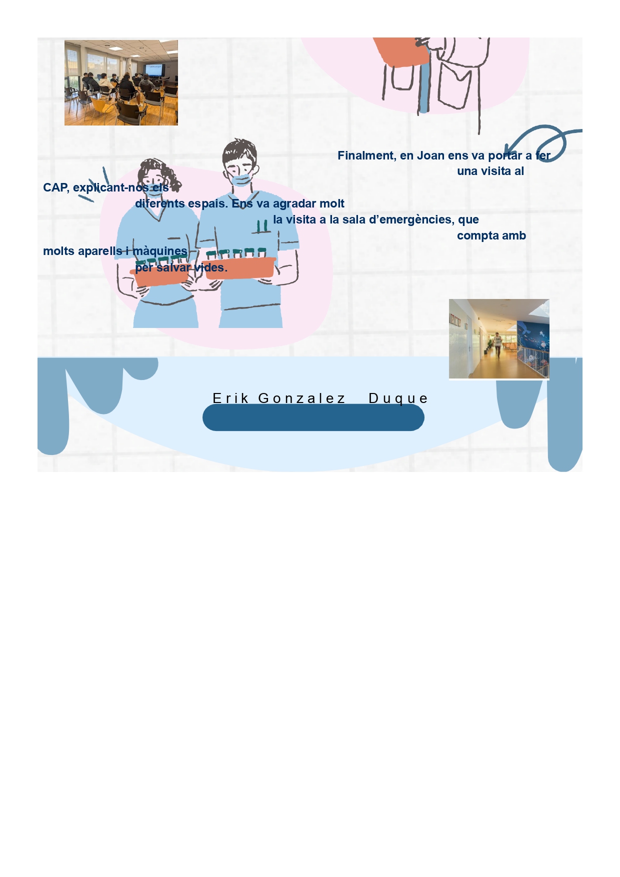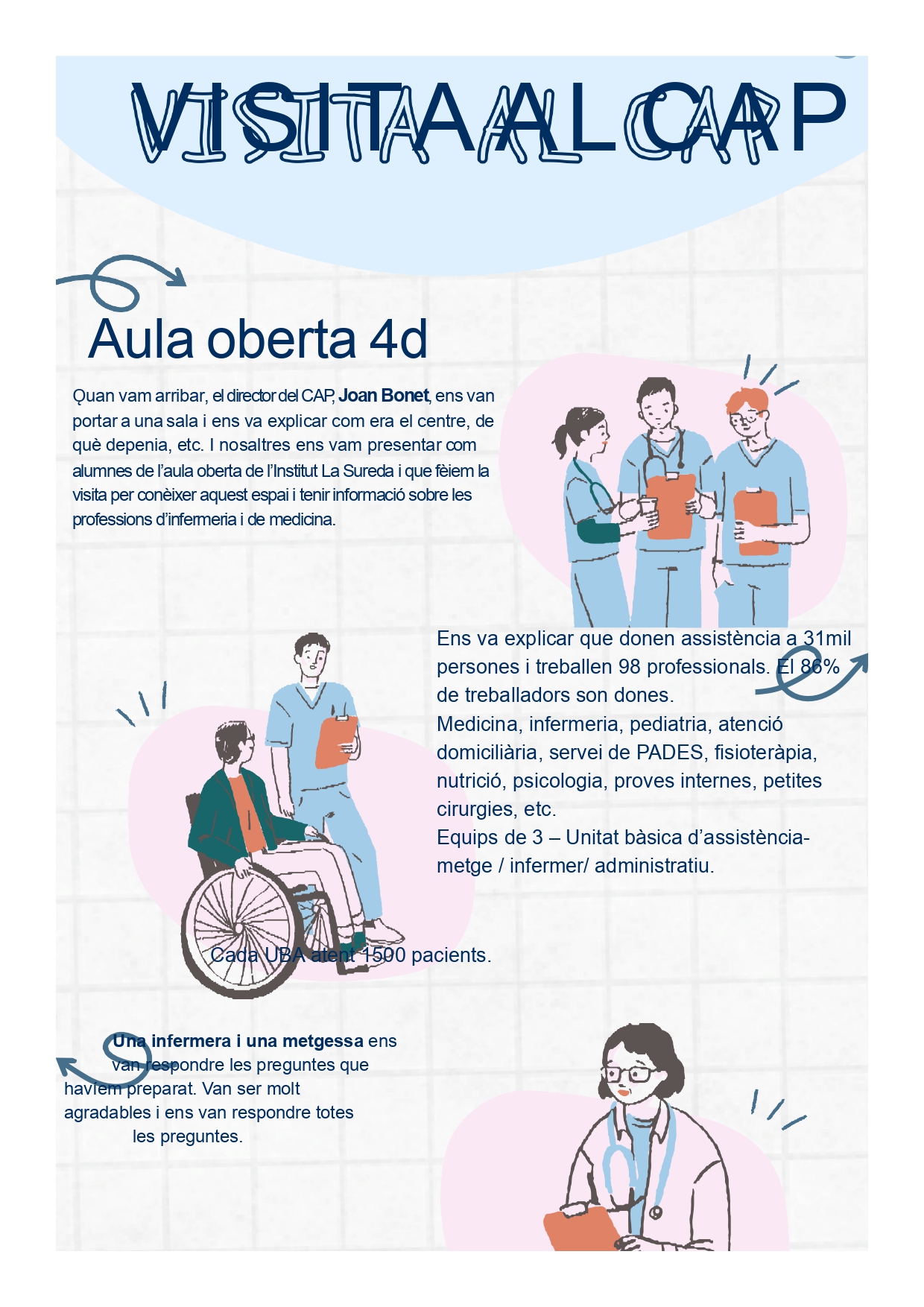 Quan vam arribar, el director del CAP, Joan Bonet, ens van portar a una sala i ens va explicar com era el centre, de què depenia, etc. I nosaltres ens vam presentar com a alumnes de l’aula oberta de l’Institut La Sureda i que fèiem la visita per conèixer aquest espai i tenir informació sobre les professions d’infermeria i de medicina.