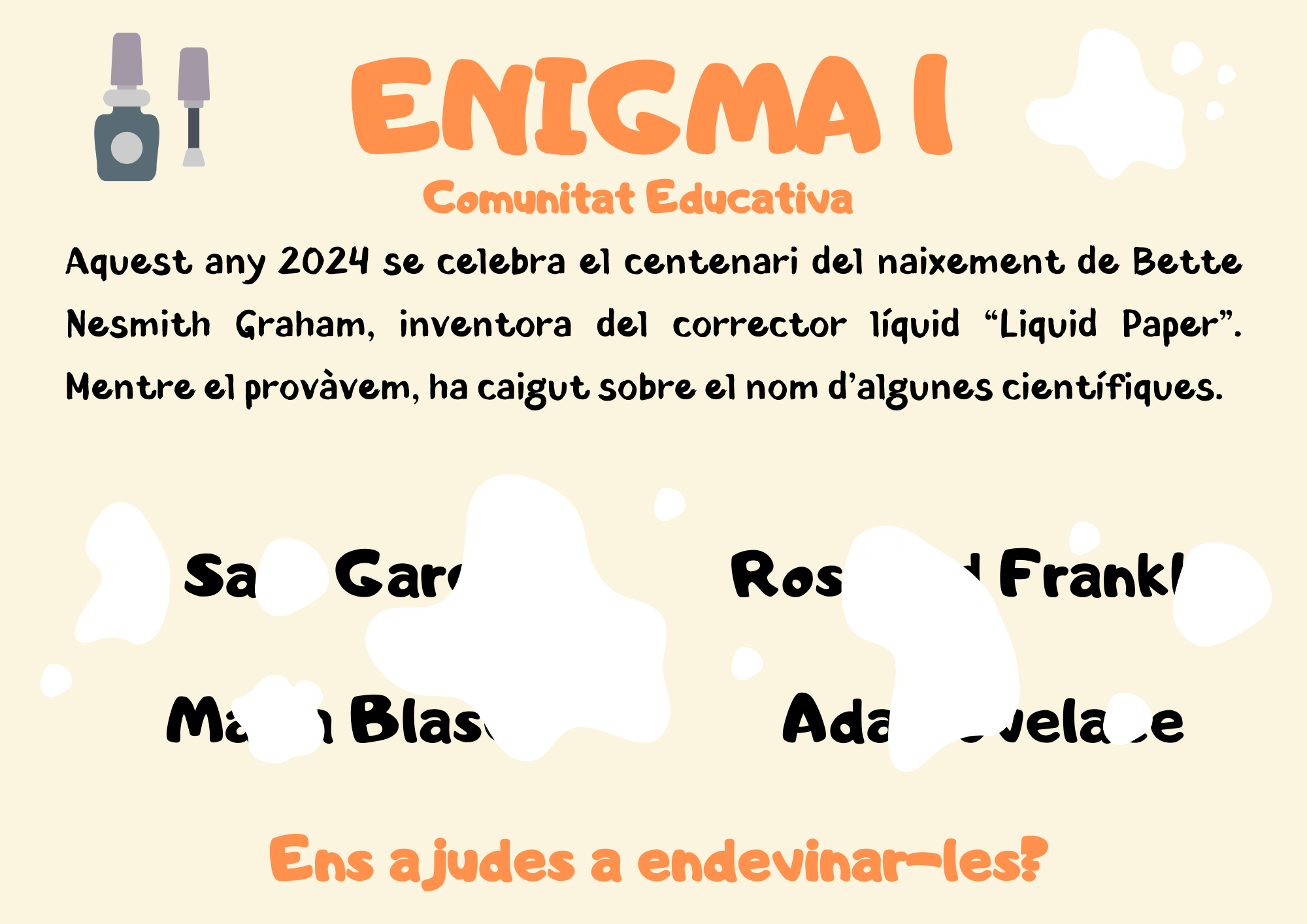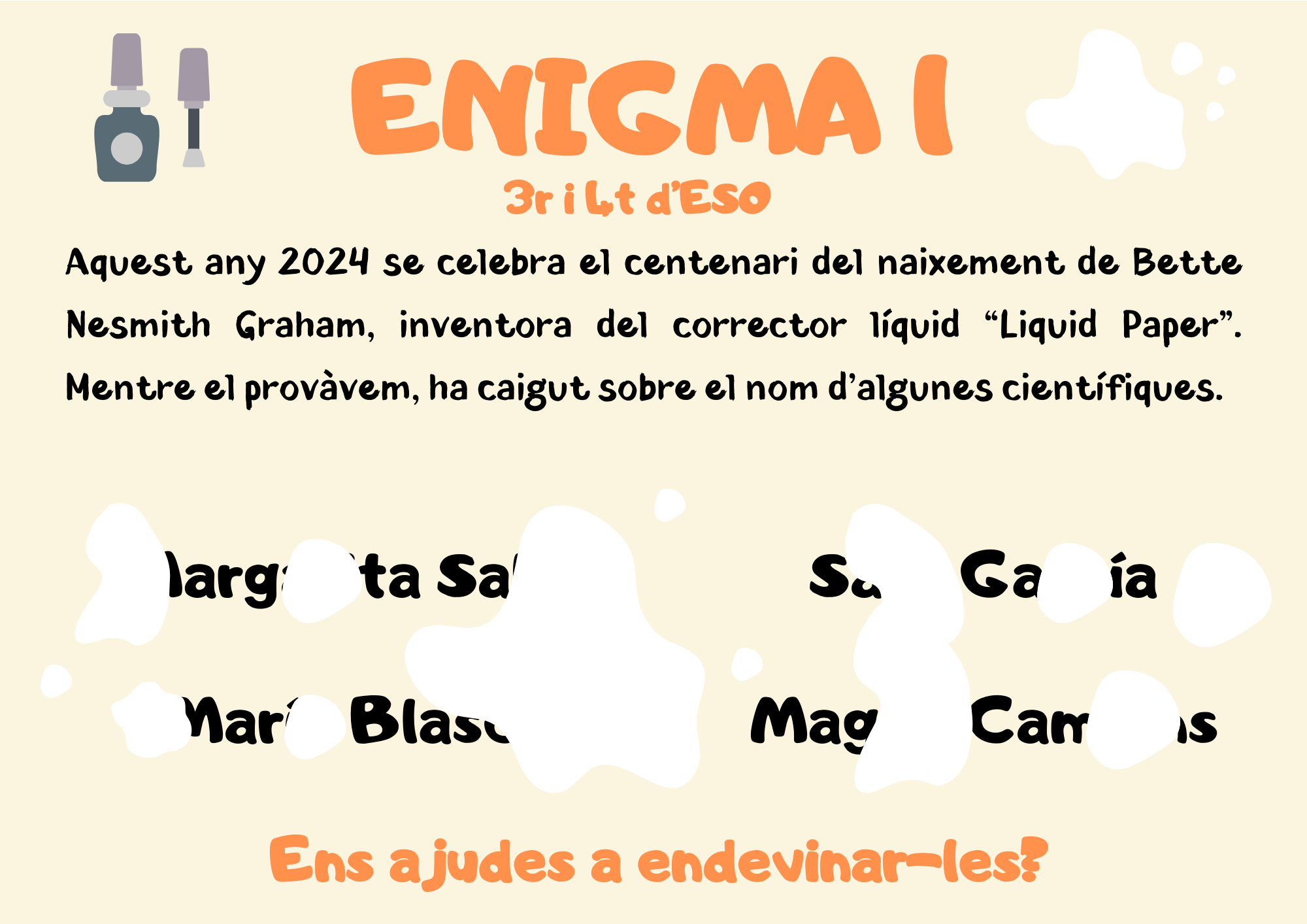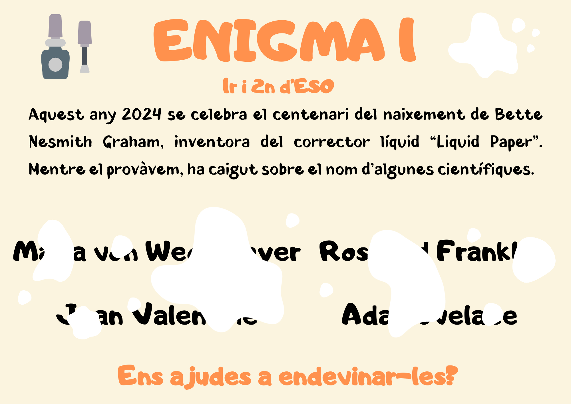 Avui engeguem el Concurs d’Enigmes de la Setmana de la Ciència 2024. Durant aquesta setmana, cada dia us plantejarem un enigma relacionat amb la temàtica de la Setmana de la Ciència i diferents esdeveniments que es commemoren en aquesta edició. Pot participar tot l’alumnat del centre en dues categories (1r cicle d’ESO i 2n cicle d’ESO) i tota la comunitat educativa (famílies, professorat i PAS). Per participar, només cal que estigueu atents i atentes a la pàgina web i a l’Instagram del centre on cada dia trobareu el nou enigma i divendres el formulari on fer-nos arribar les vostres respostes.