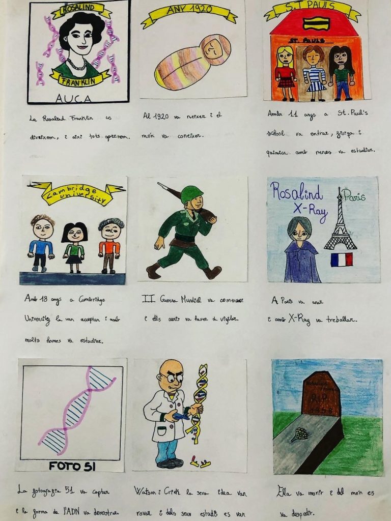 A la matèria de llengua i literatura catalana hem aprofitat per treballar l’auca. Hem repassat la vida de la Rosalind Franklin i l’hem plasmat en una auca. L’alumnat s’ha inventat rodolíns fent referència a les vinyetes, prèviament dibuixades, dels moments clau de la seva vida.