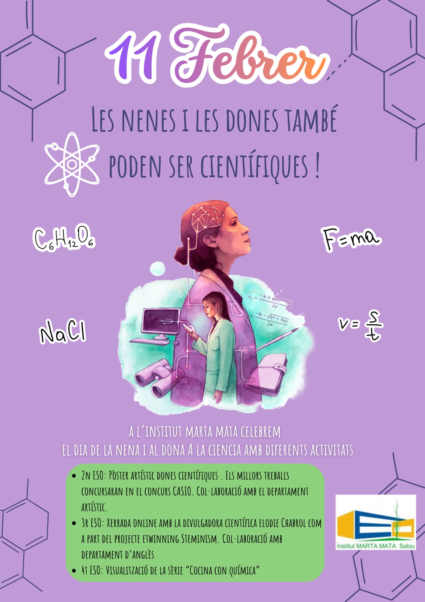 El departament de ciències junt amb el departament d’arts i el d’anglès han preparat unes activitats per celebrar el Dia de la dona i la nena científica. Els alumnes de la ESO participen en un concurs de CASIO preparant uns pòsters artístics, podran parlar amb la divulgadora científica Elodie Chabrol, i iniciar-se a sèries amb contingut científic.